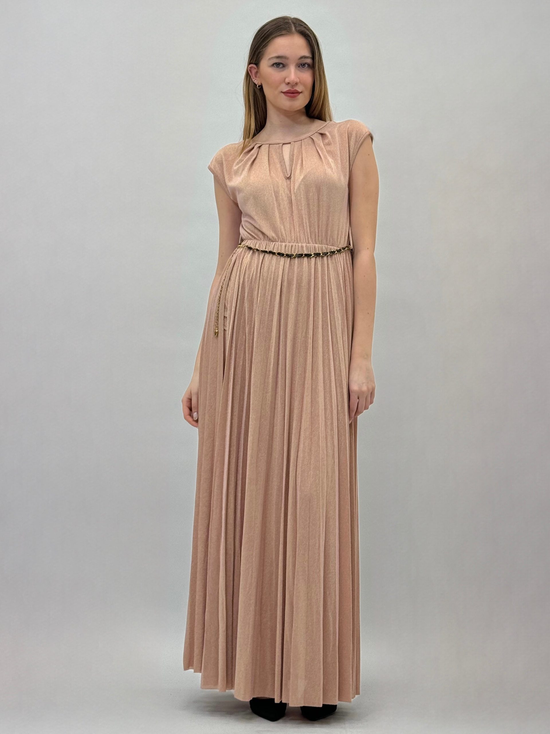 Abito lungo con spacchi laterali. Con pantaloncino. Veste elasticizzato. Cintura in vita regolabile.