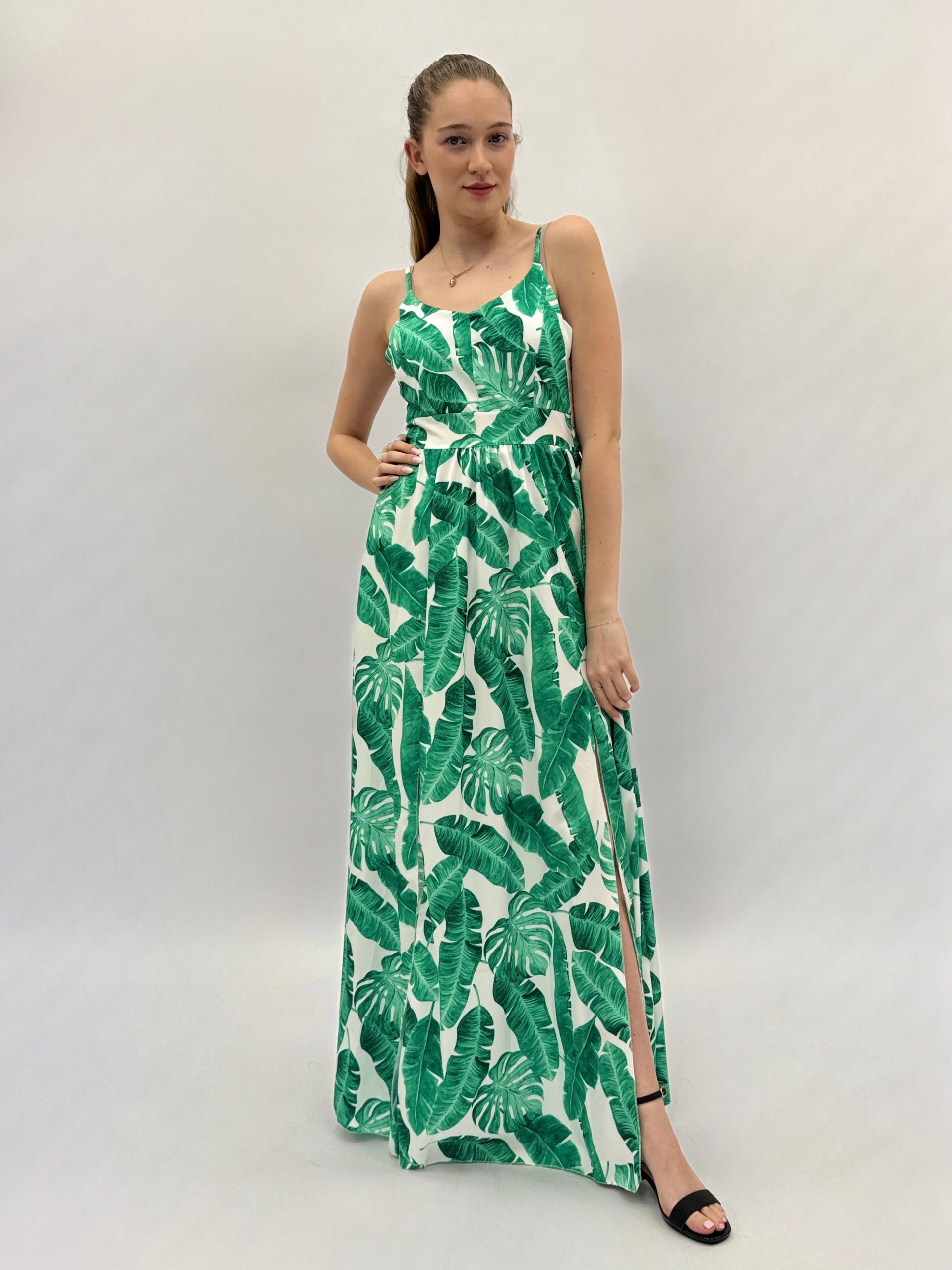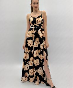 Abito con spacco floreale e spalline. Elasticizzato. Gonna ampia.
