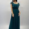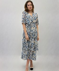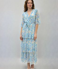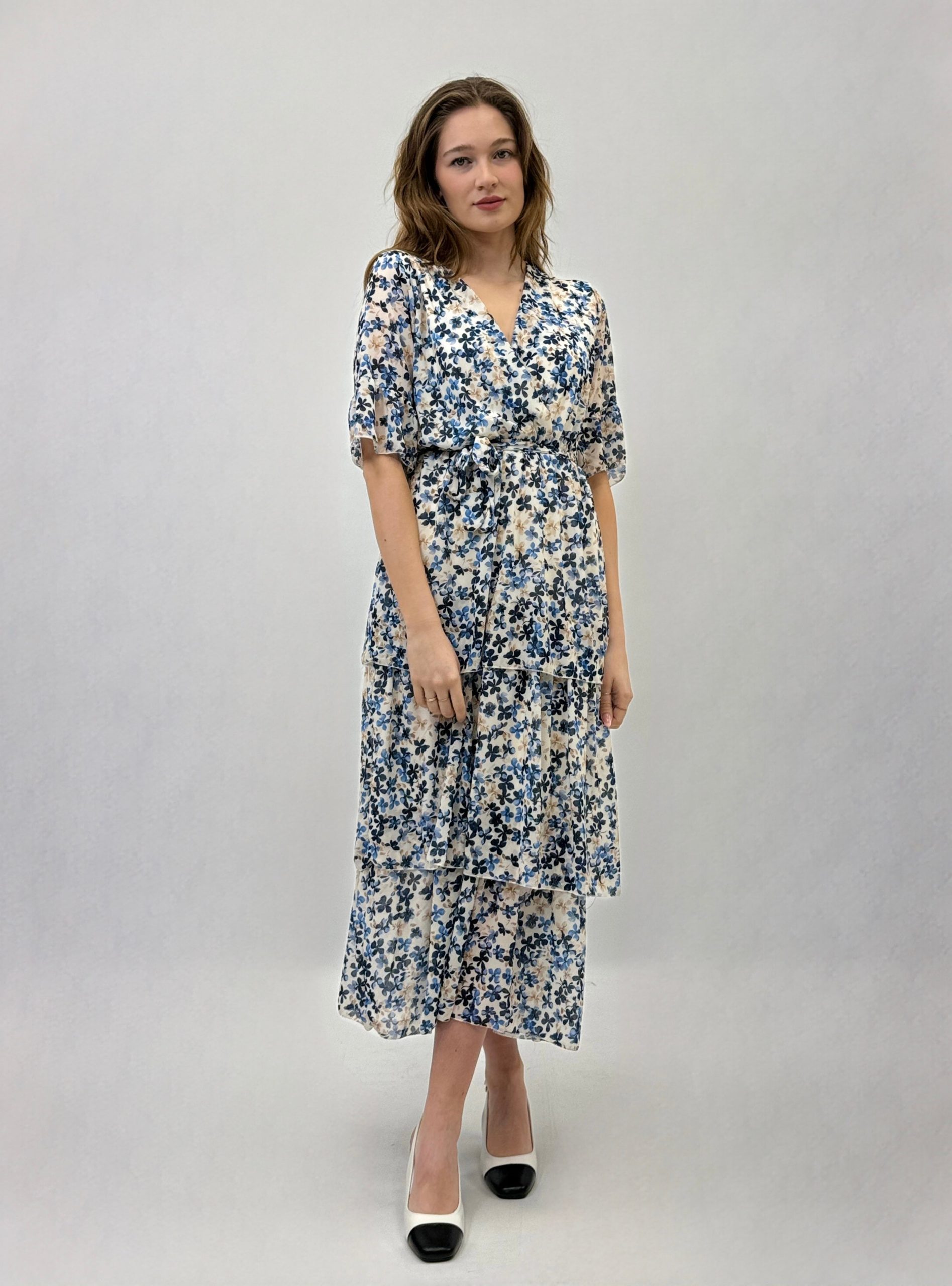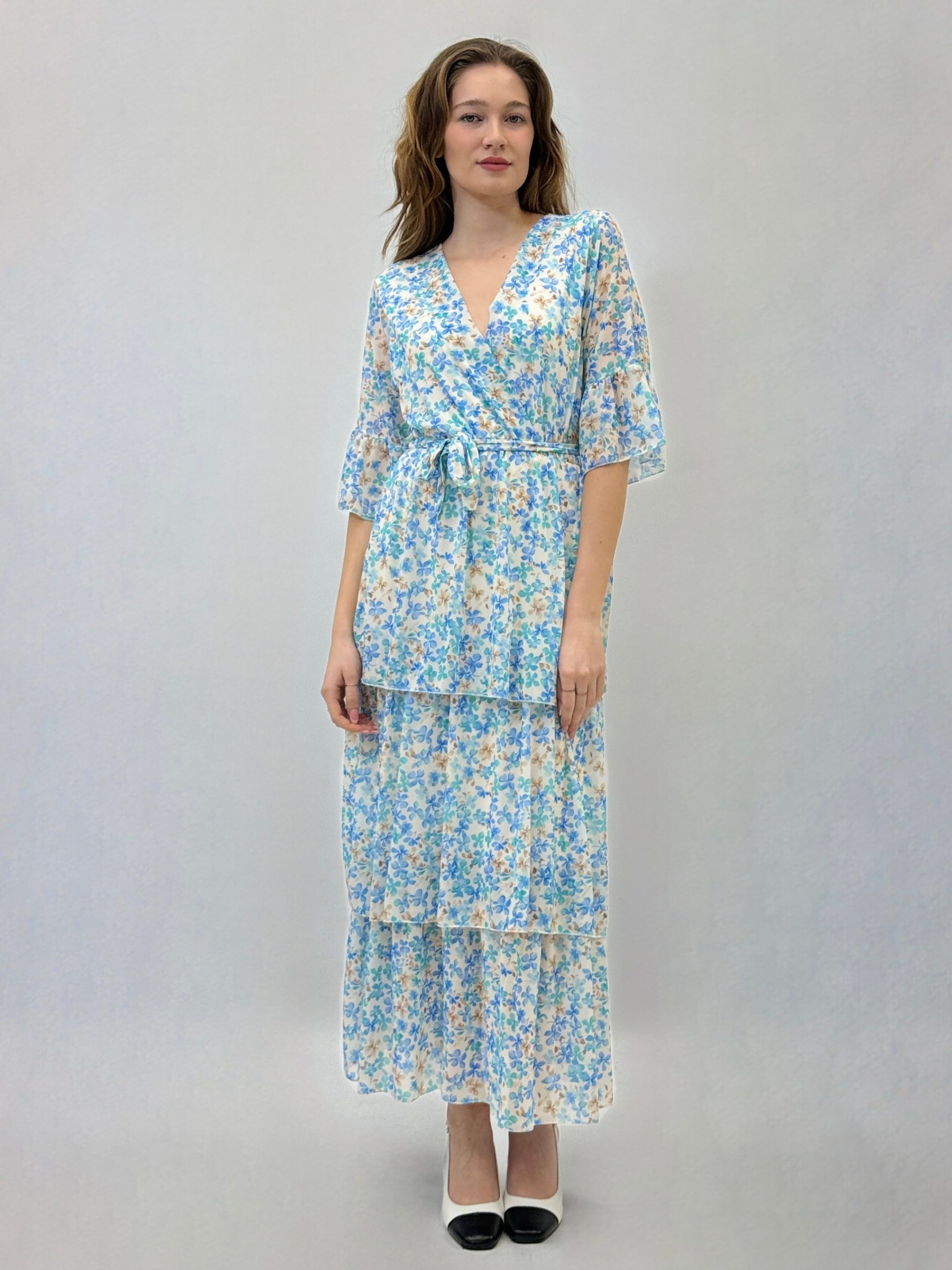Abito lungo con scollo V. Maniche a campana. Elasticizzato in vita. Gonna balze.