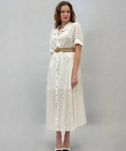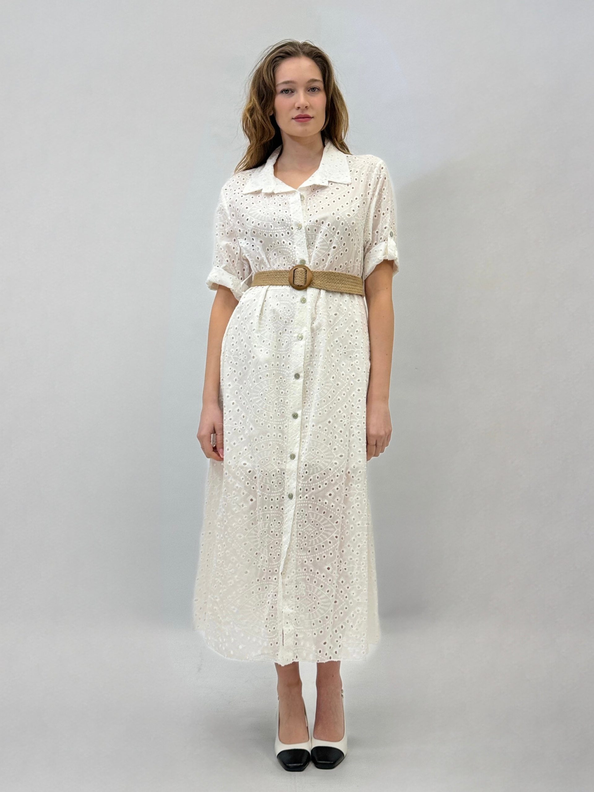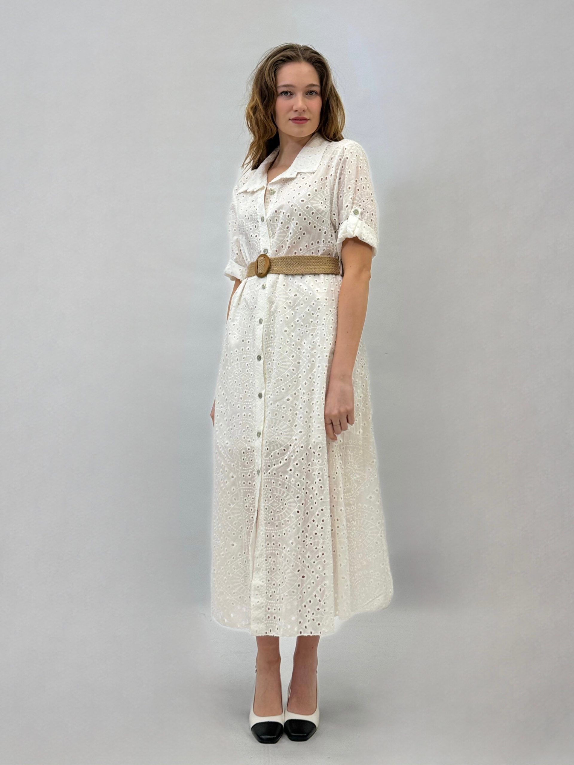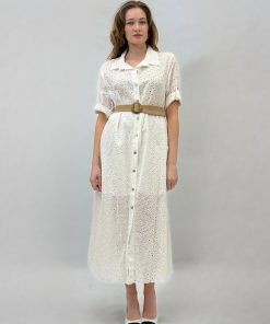 Abito in pizzo sangallo con cintura. Veste comodo.