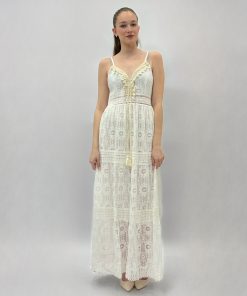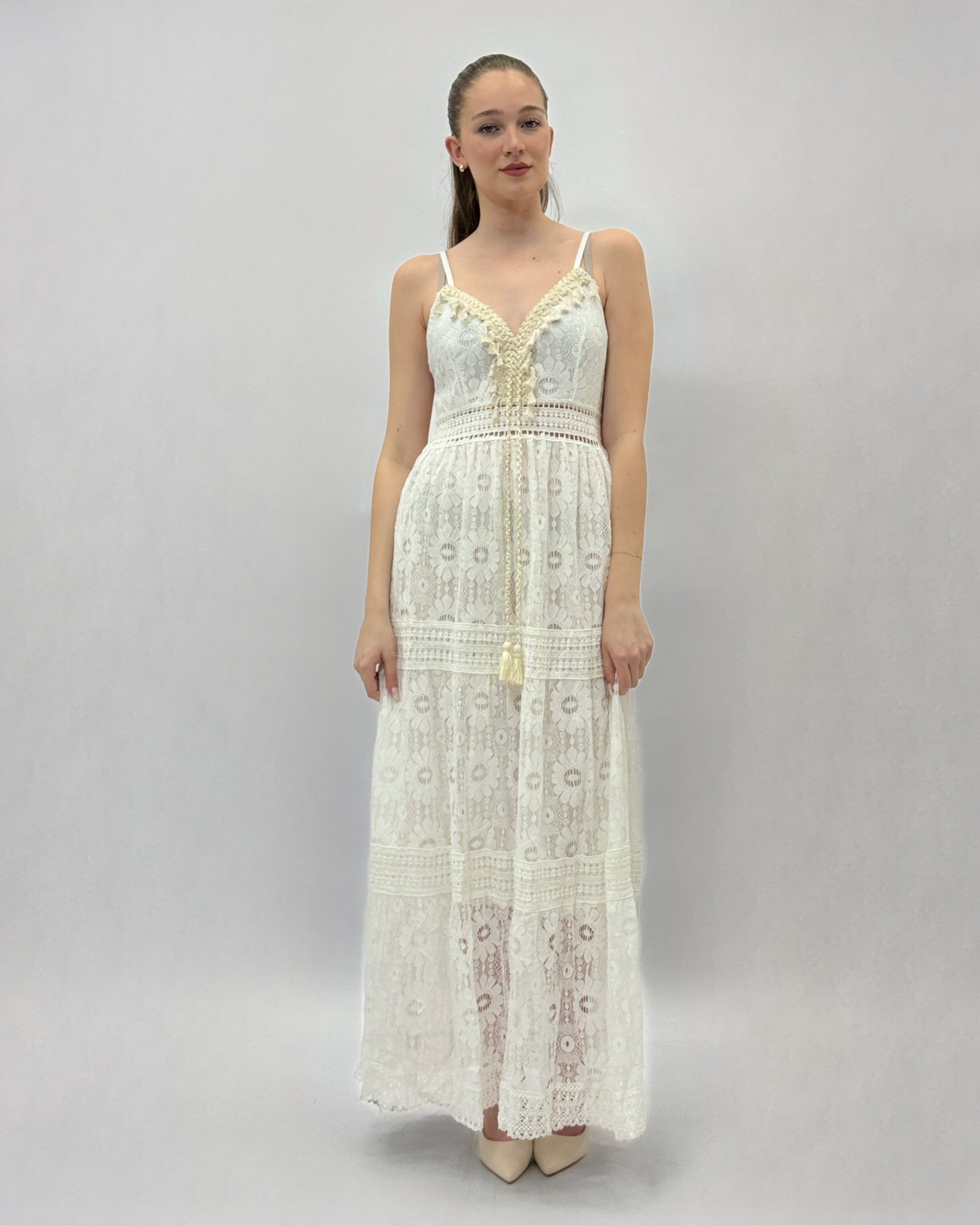 Abito in pizza sangallo con spalline e scollo a V. Dettaglio ricami. Spalline regolabili. Elasticizzato.