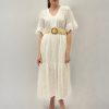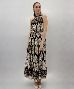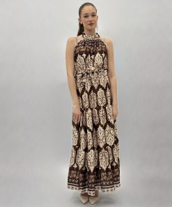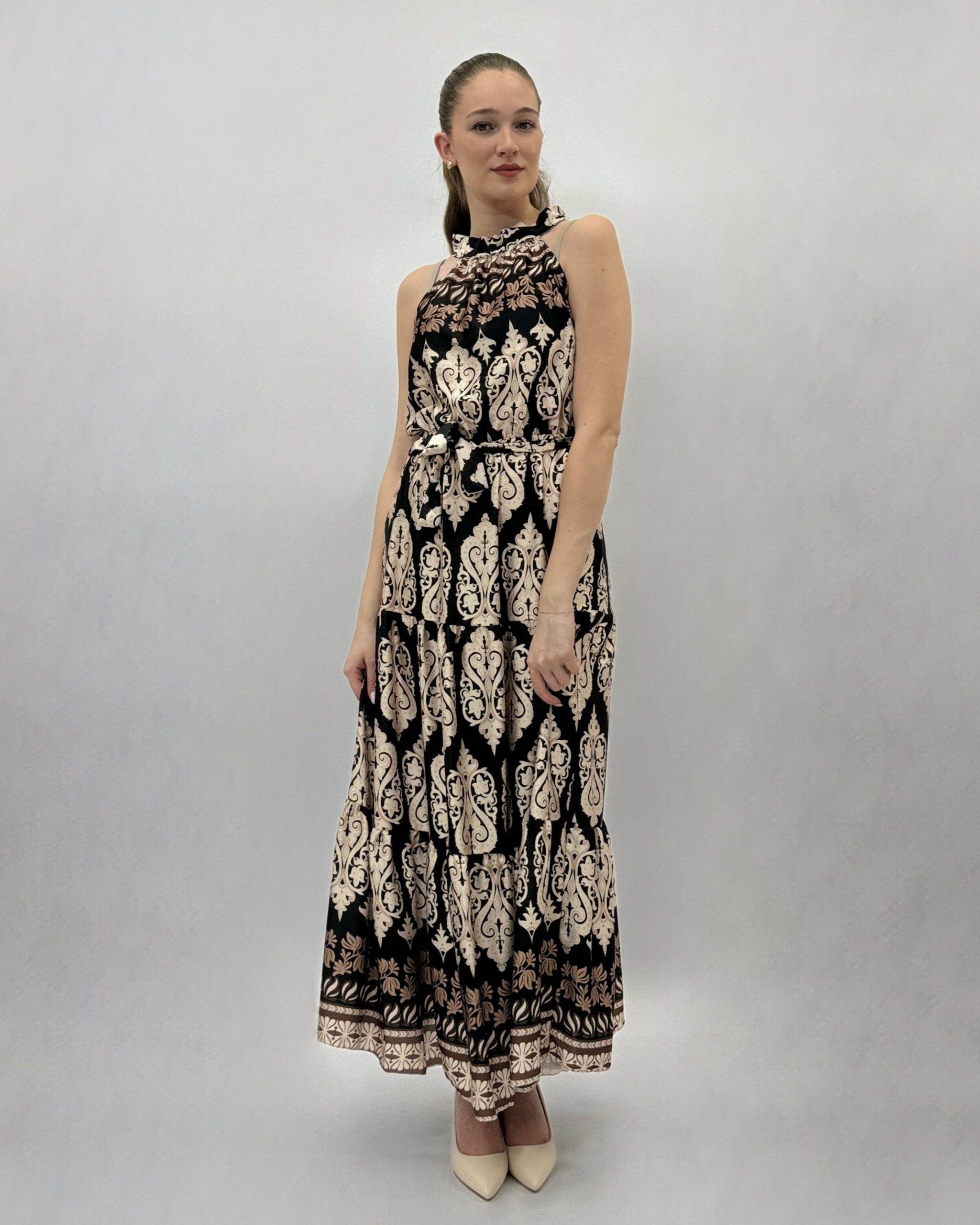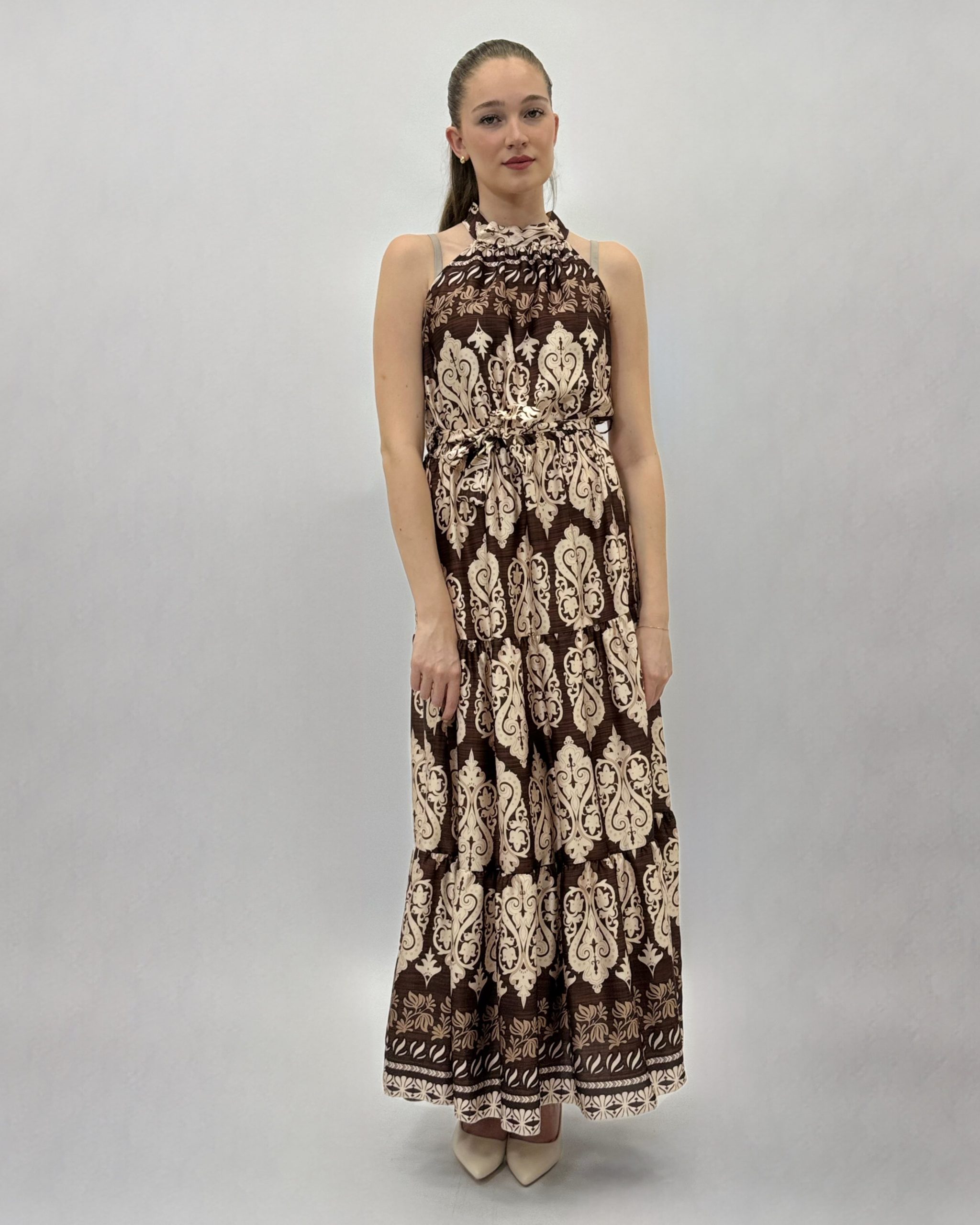 Abito lungo senza spalline con scollo all’americana e cintura in vita.