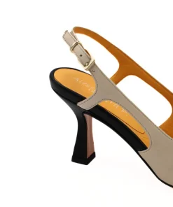 Sandalo, da donna, di ALESSANDRA PELUSO. Esternamente in pelle beige, tacco rivestito in pelle nera. Chiusura con cinturino regolabile alla caviglia. Internamente, e nel morbido sottopiede, foderato in pelle. Suola in cuoio e tacco di 8 cm.