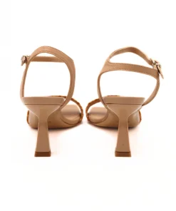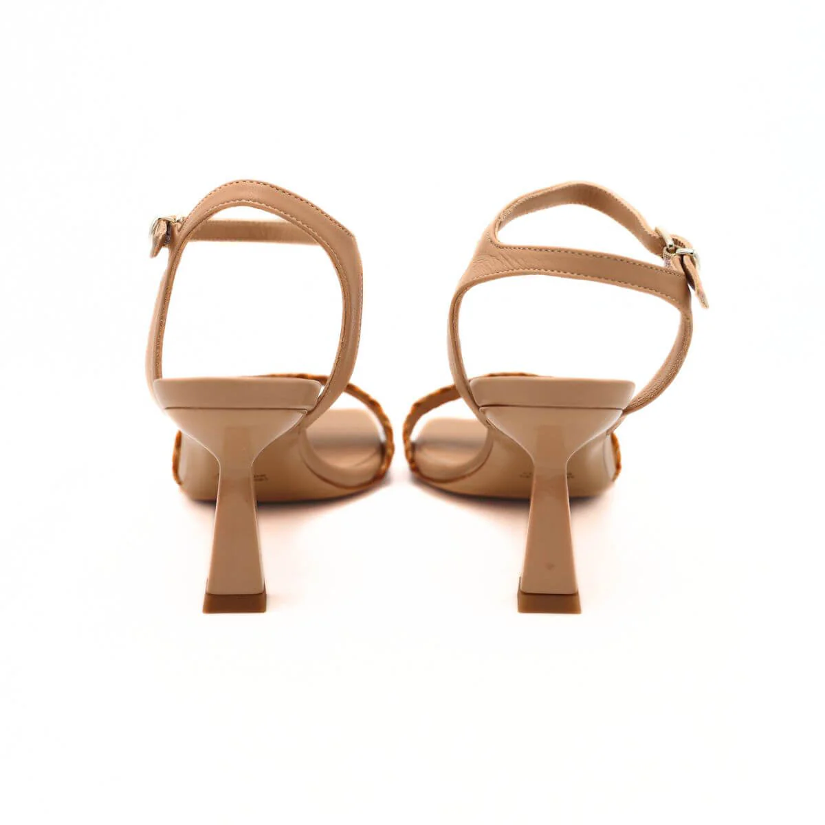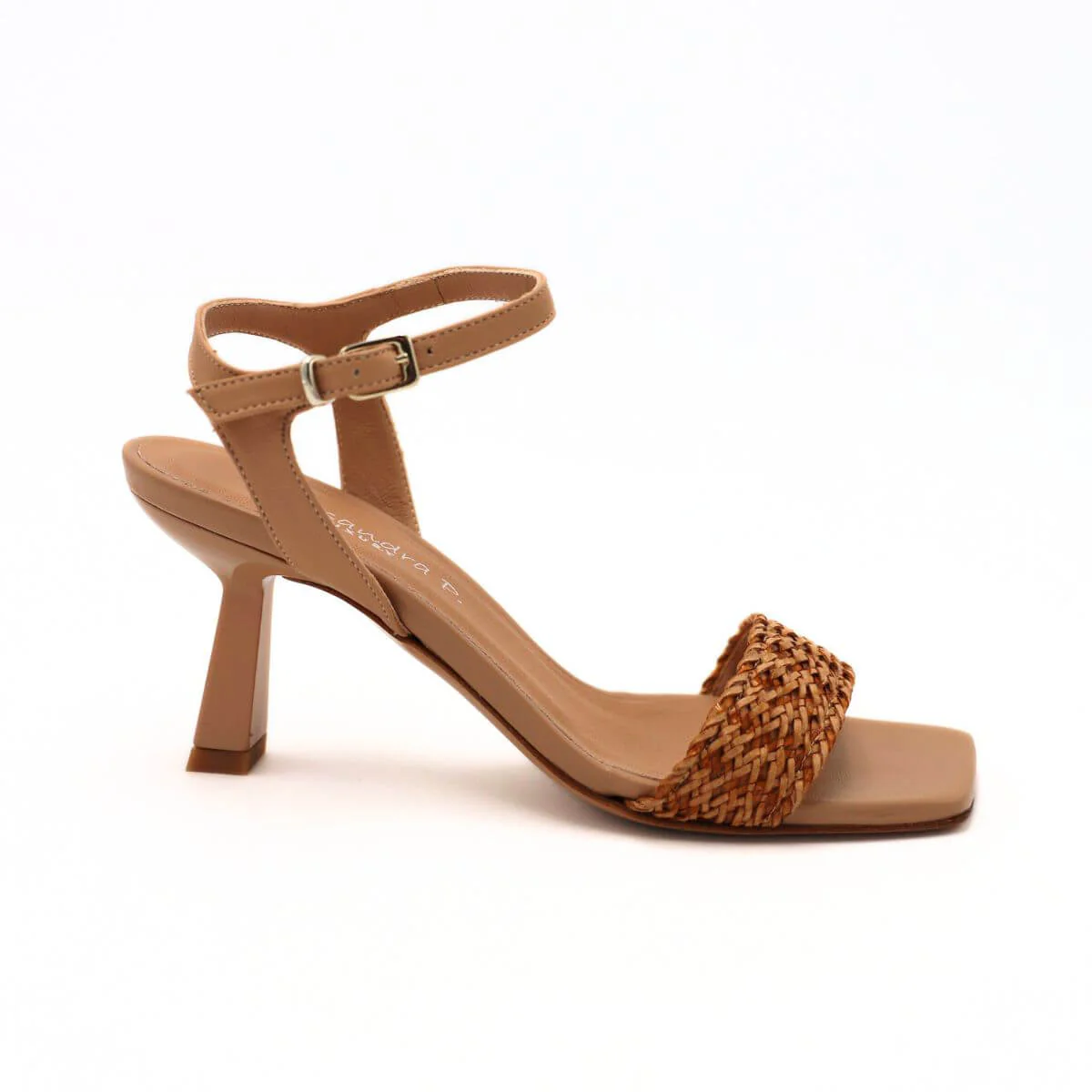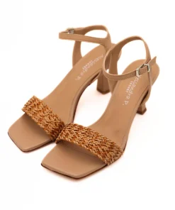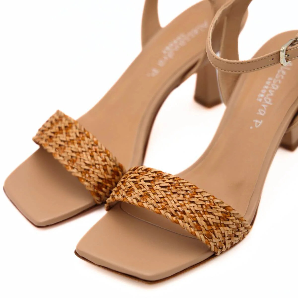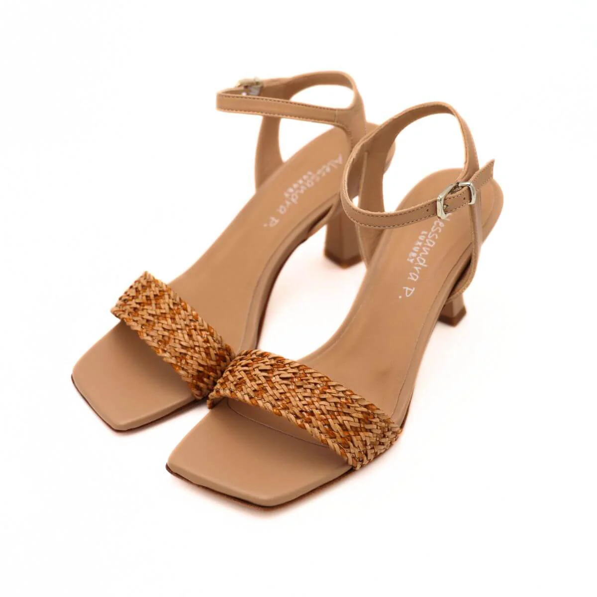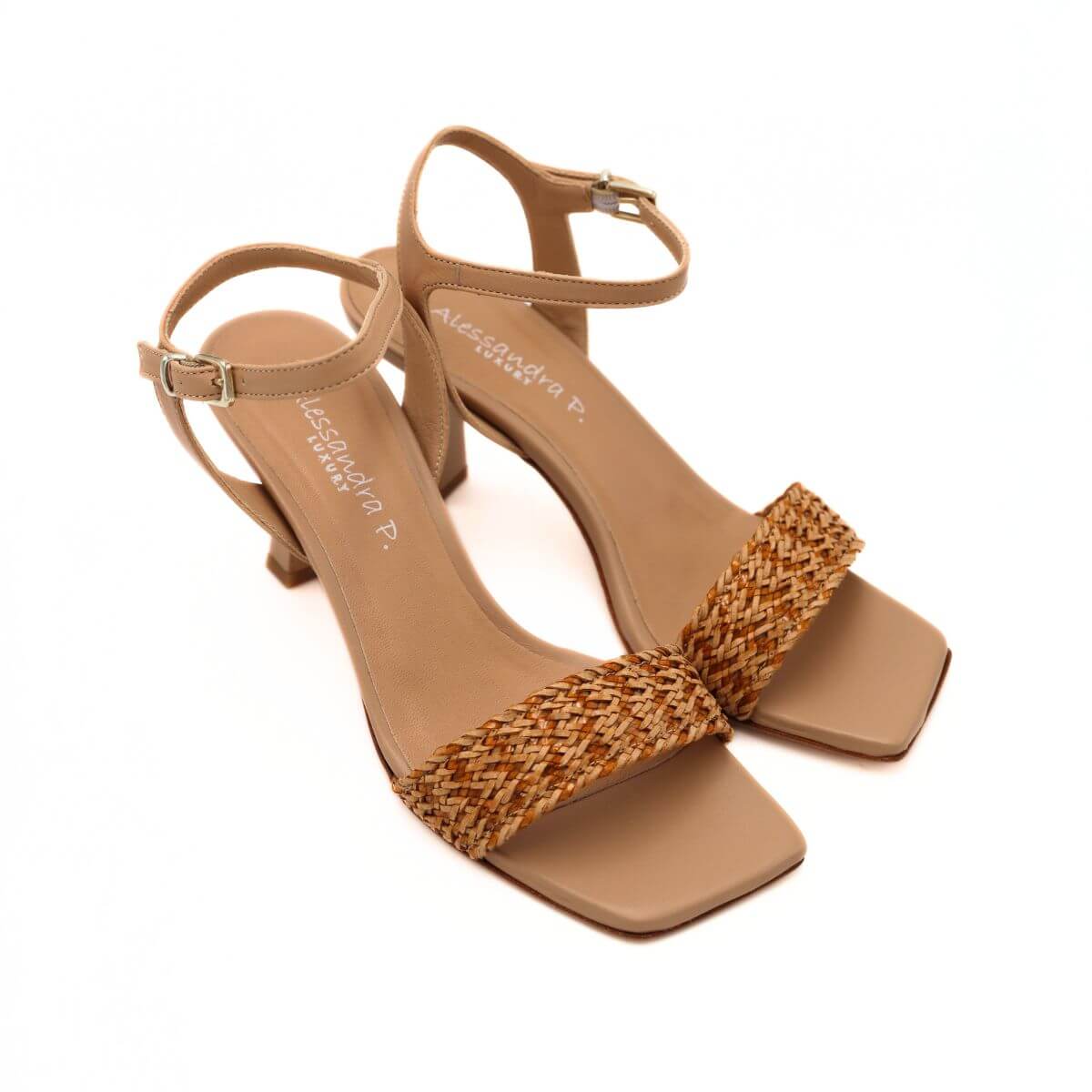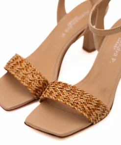 Sandalo con tacco di ALESSANDRA PELUSO, realizzato in morbida pelle beige, con cinturino alla caviglia regolabile. Fascia intrecciata in raffia. Morbido sottopiede in tono con punta squadrata e suola in vero cuoio.