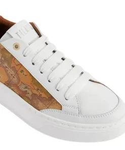 Sneakers da donna di ALVIERO MARTINI 1^ CLASSE realizzata in pelle bianca con inserti in tesssuto effetto nappa con cartina geofrafica. Interno in tessuto, sottopiede non estraibile in pelle. Chiusura con laccio.