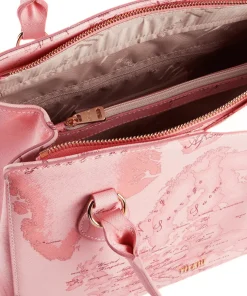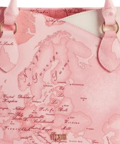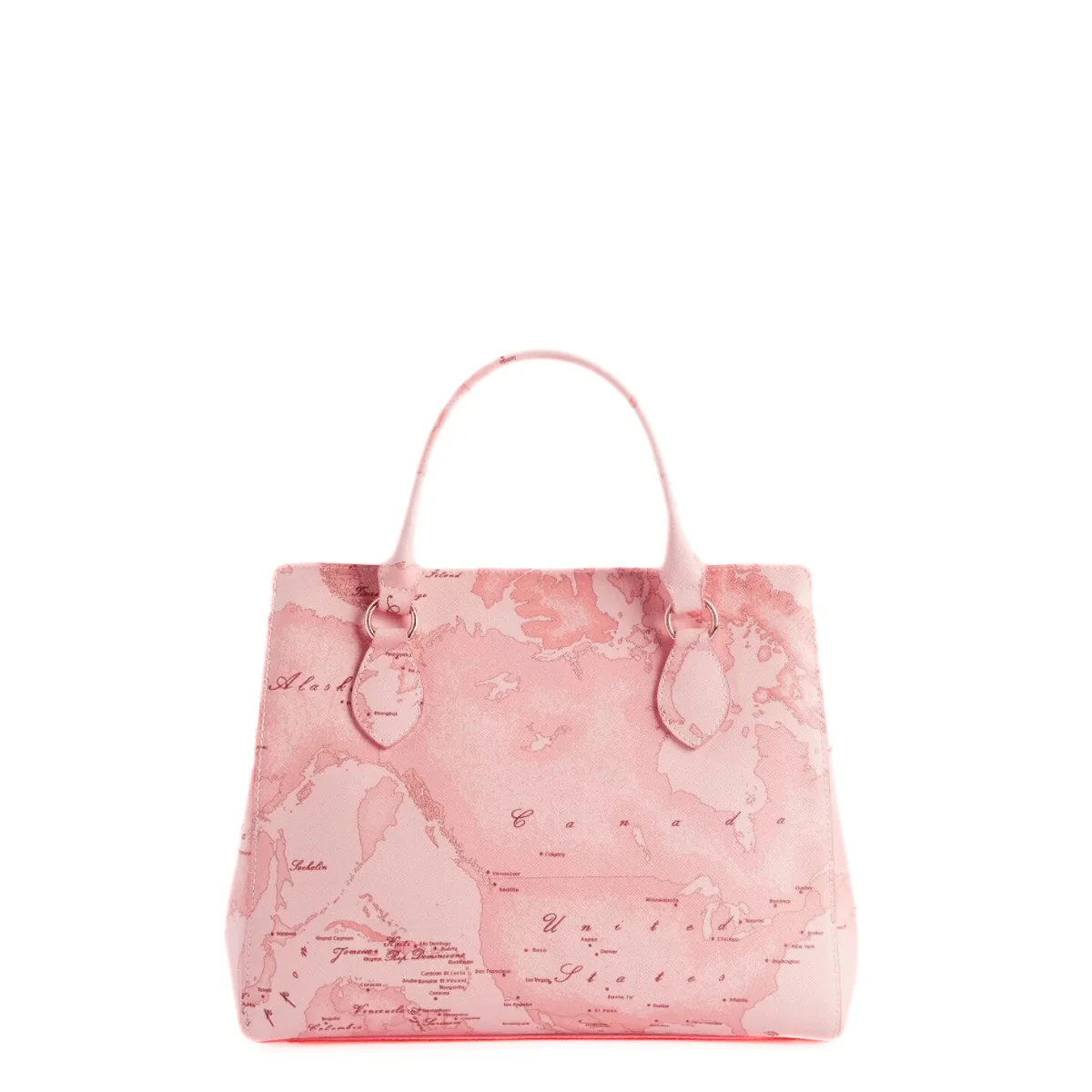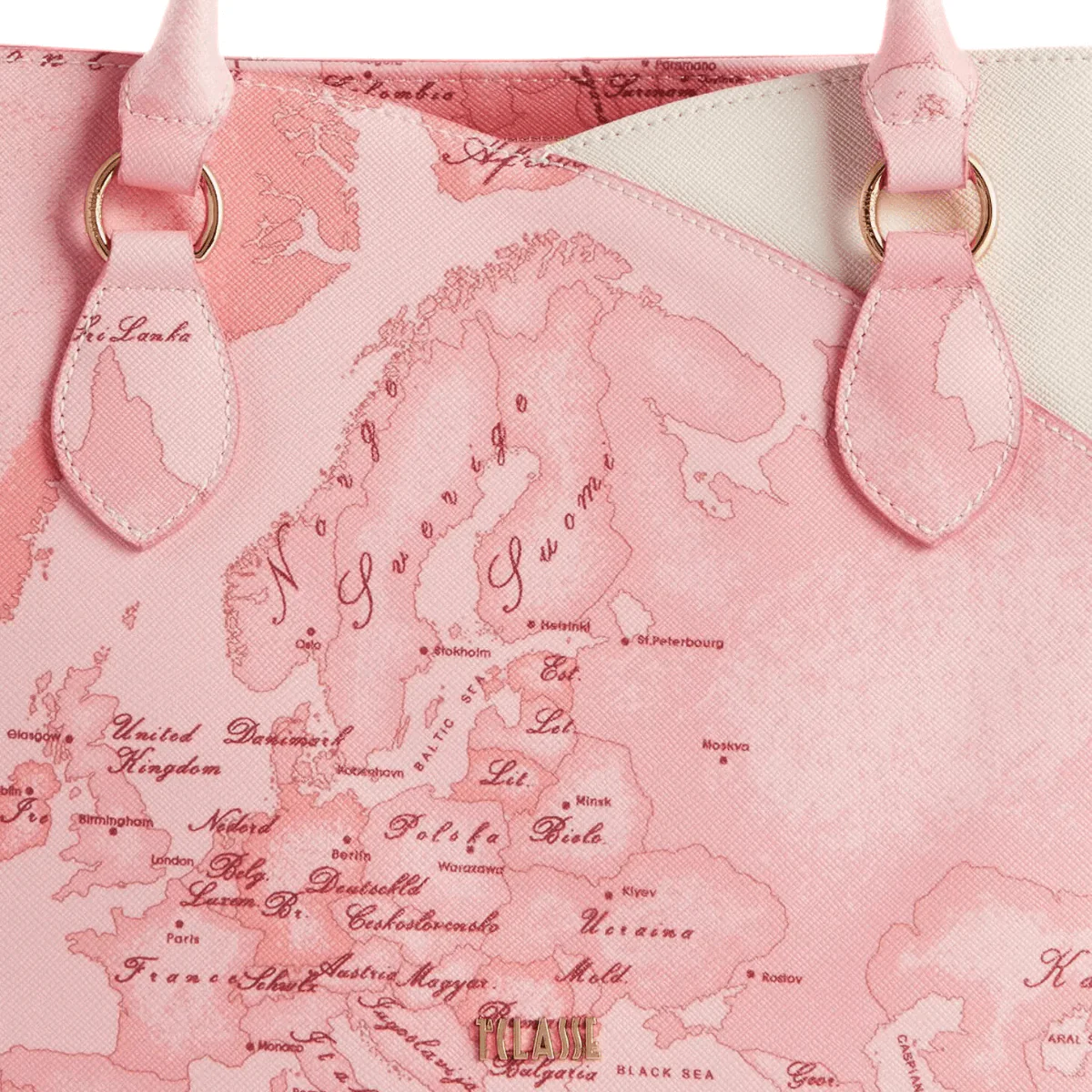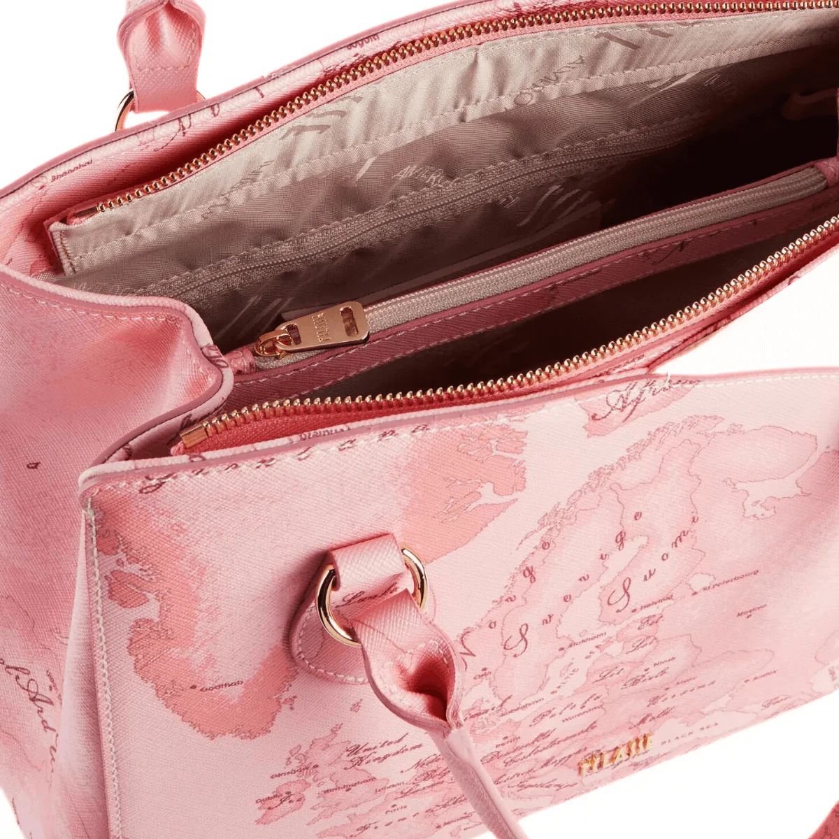 Borsa a mano di ALVIERO MARTINI 1^CLASSE. Realizzata esternamente da tessuto goffrato saffiano stampa Geo Magnolia e inserto bianco, decorata con logo 1ᴬ Classe frontale. L’interno offre due capienti scomparti separati da una tramezza chiusa con zip e completati da tasche. Grazie alla tracolla rimovibile la borsa si può indossare anche crossbody.