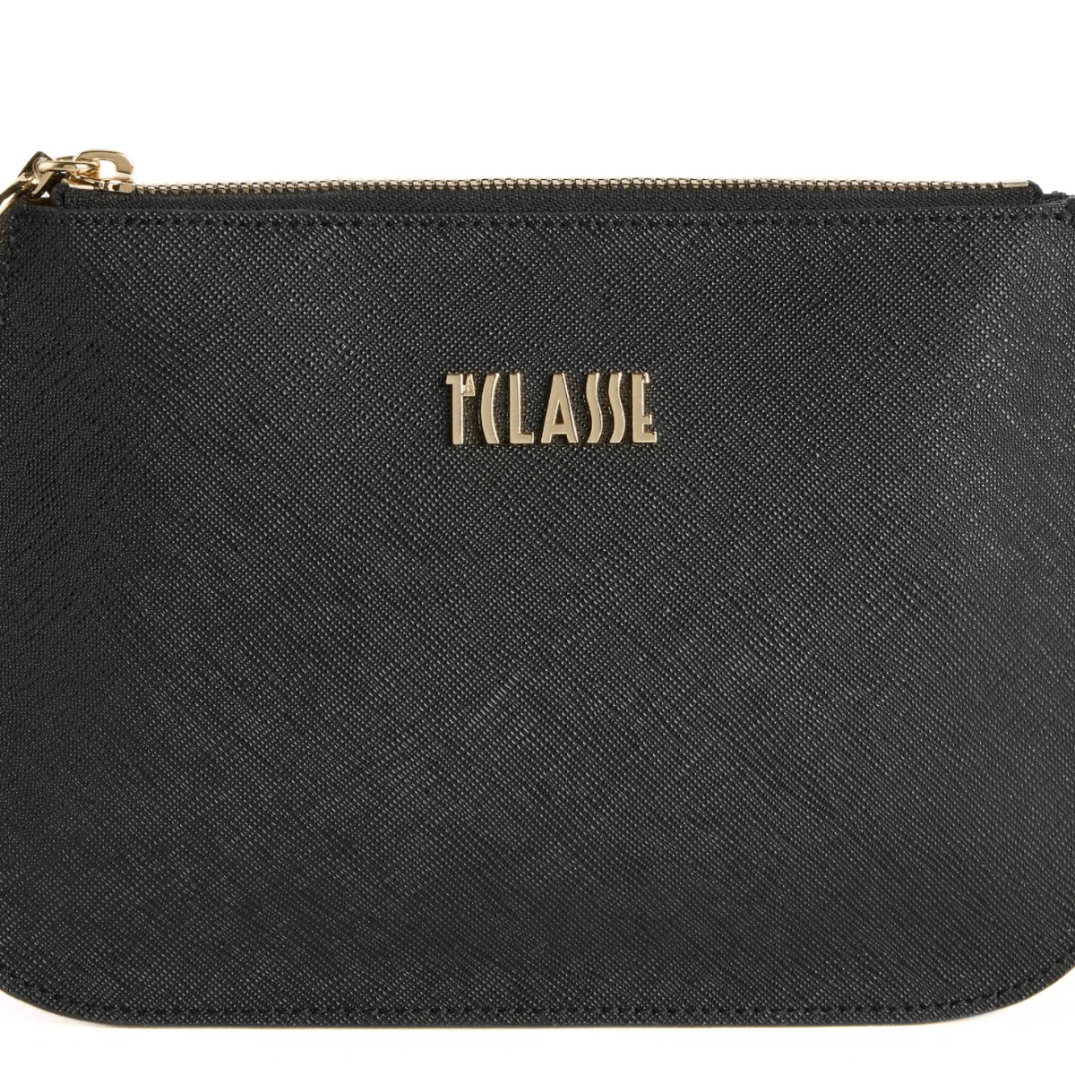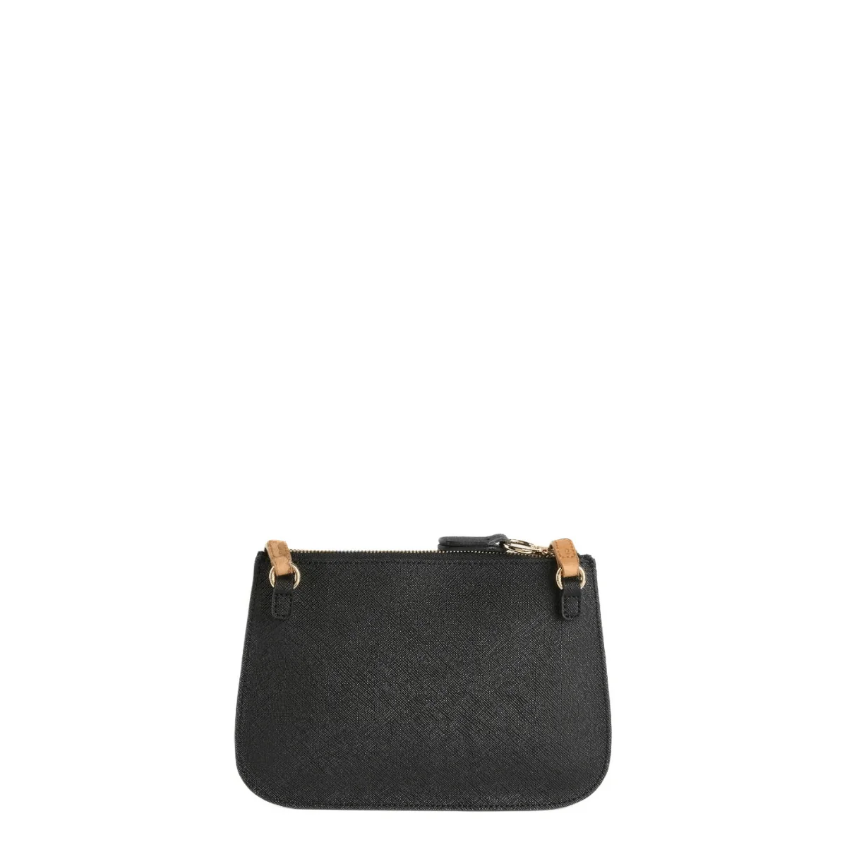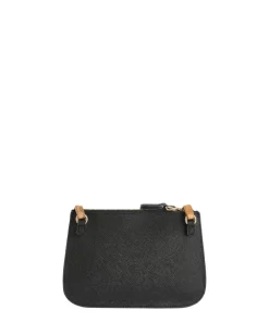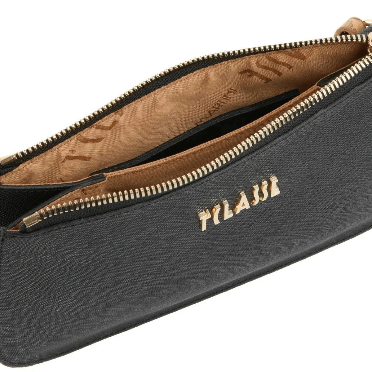 Borsa pochette di ALVIERO MARTINI 1^CLASSE. Realizzata in tessuto saffiano nero con tracolla regolabile in tessuto Geo Classic. Interno con due comparti con tasche interne.