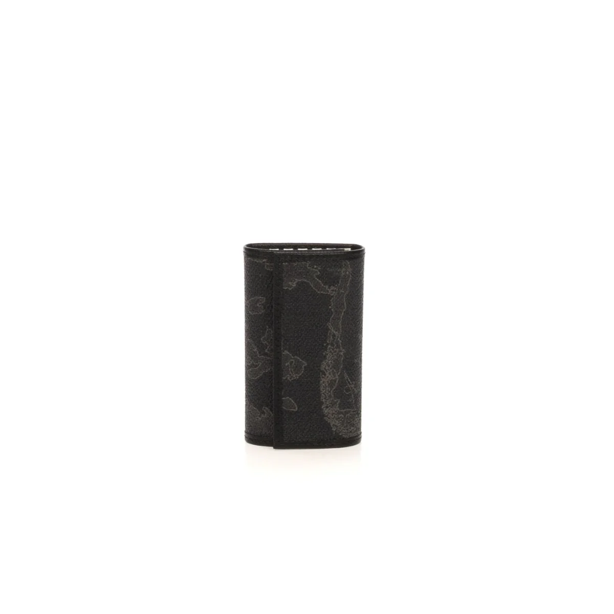 Portachiavi di ALVIERO MARTINI 1^CLASSE, misura piccola, realizzato in tessuto stampato Geo Black con dettagli in pelle nera. 6 ganci in metallo palladio. Chiusura con doppio bottone a pressione.