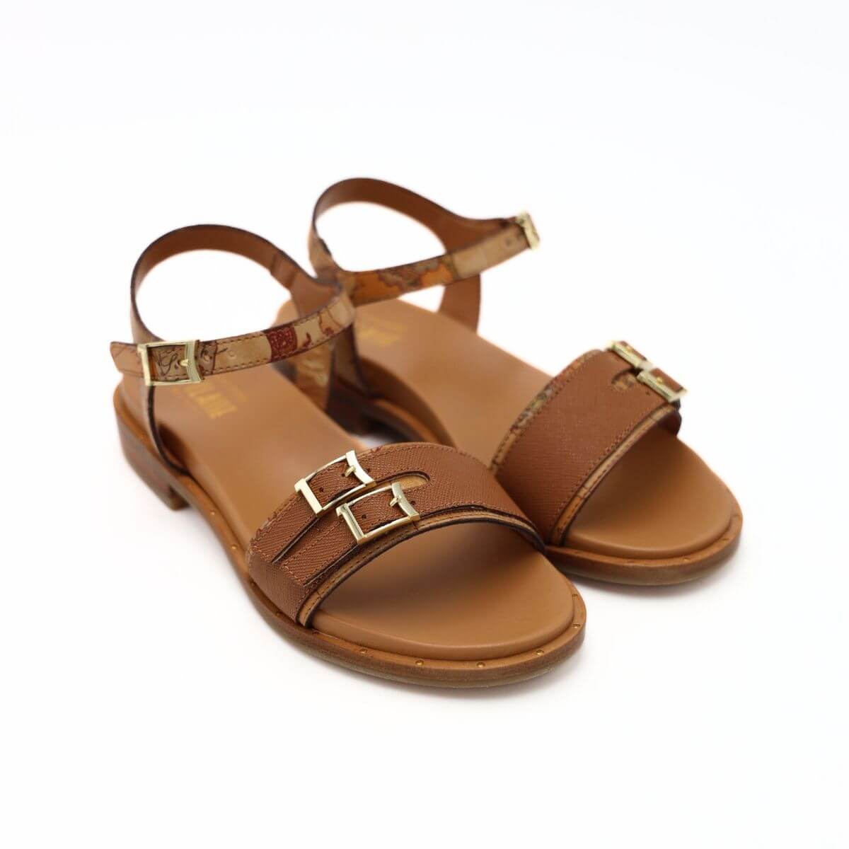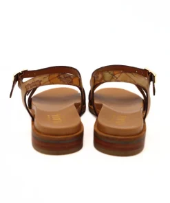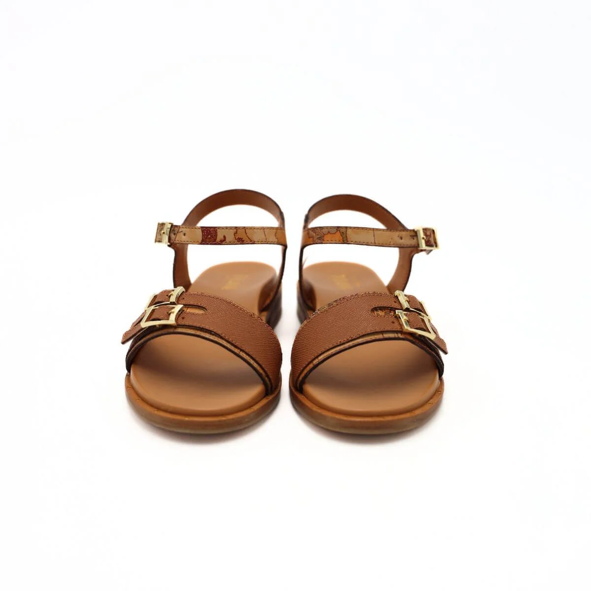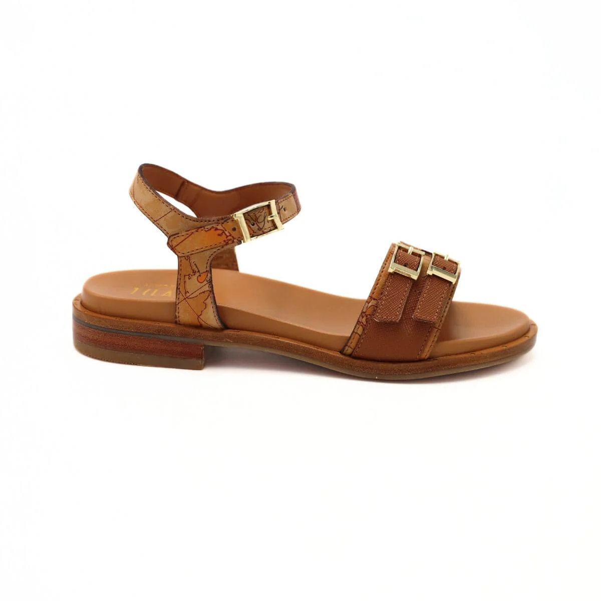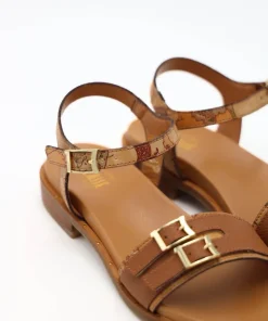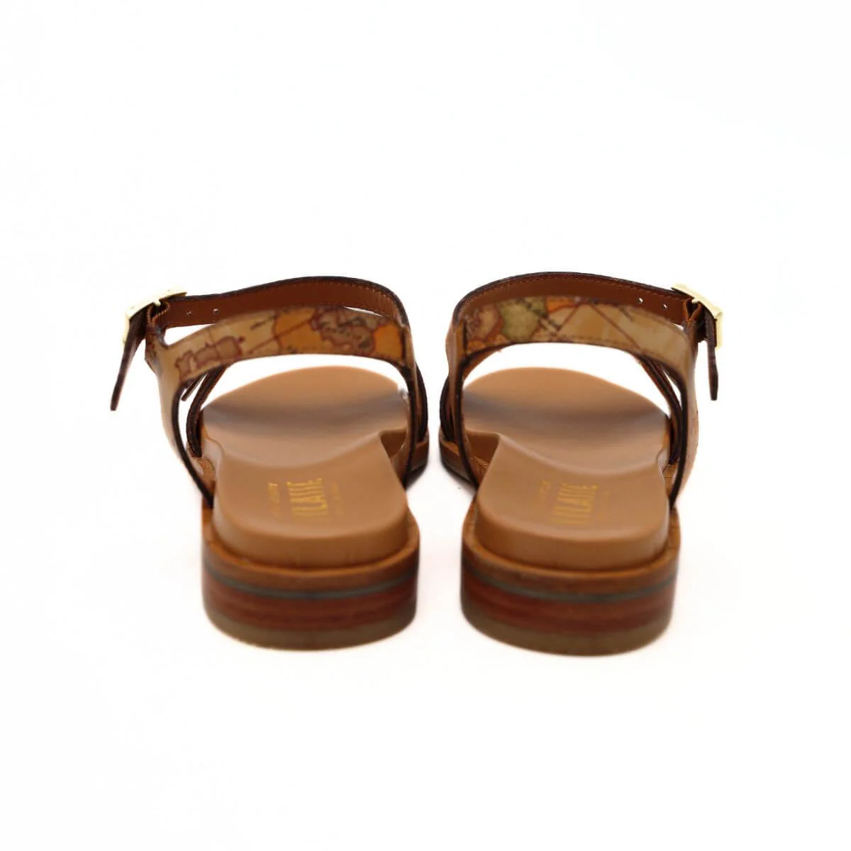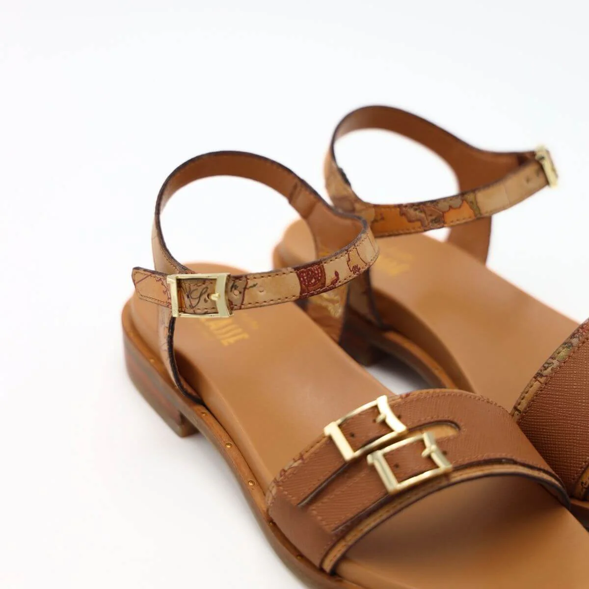 Sandalo da donna di Alviero Martini 1^ Classe. Realizzato in similpelle con stampa Geo Classic e con fascia con fibbie cuoio. Interno foderato in similpelle color cuoio. Chiusura con fibbia e cinturino regolabile alla caviglia. Suola in gomma.