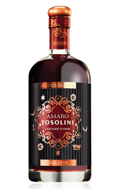 Un raffinato liquore alle erbe, preparato secondo la ricetta del fondatore con l’orignale miscela di 15 varietà di erbe Mediterranee macerate con acquavite d’uva in tini di frassino e distillate in alambicchi botanici. Salicornia, Limonio, Finocchio marino, Assenzio marino (il prezioso Santonego raccolto a mano nella laguna friulana), assieme all’uso di purissima acqua delle Alpi friulane e della stagionatura in carati, regalano una sfumatura unica e inconfondibile all’Amaro Tosolini. Retrogusto di arancia amara ed un finale con note di spezie mediterranee dolci.