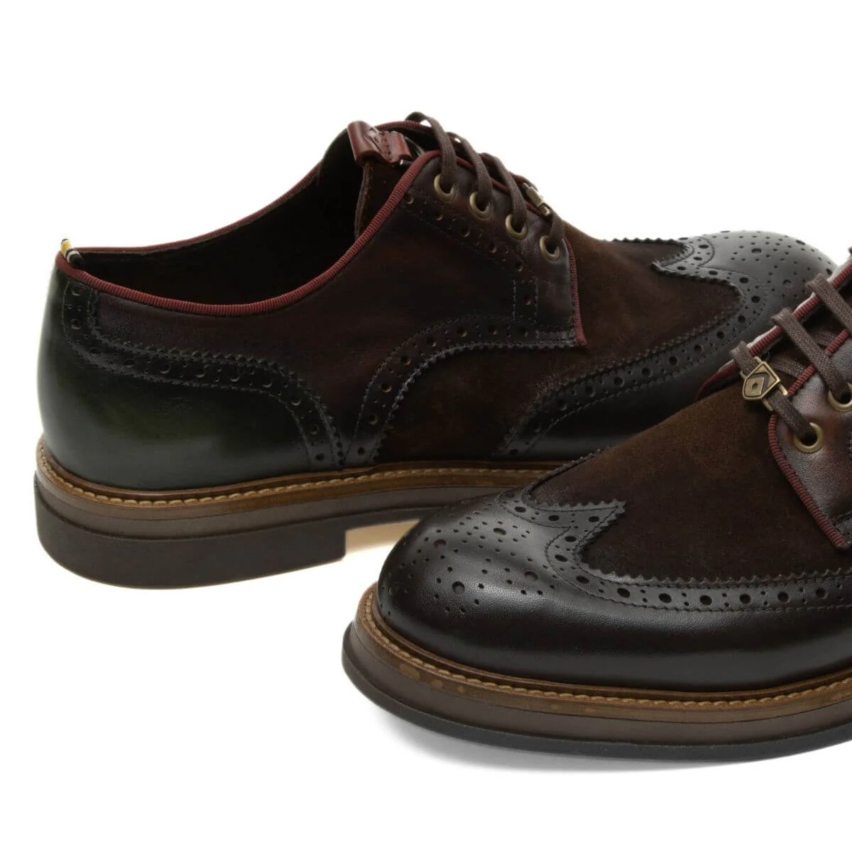 Stringata da uomo di AMITIOUS, realizzata in pelle marrone con inserti in camoscio e punta all’inglese. Interno in pelle e sottopiede, anatomico e ed estraibile, in materiale tecnico traspirante. Suola in gomma bicolore.