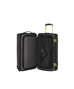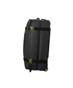 Borsone con ruote con misure trolley medio di AMERICAN TOURISTER della linea URBAN TRACK. Realizzato in tessuto riciclato spalmato nero con profili lime, doppia apertura entrambe chiuse con zip, una con cinghe ferma abiti. Chiusura con zip, ganci e sicurezza con combinazione e sistema TSA. Fondo rinforzato per permettere ai borsoni di stare in piede da soli. Due ruote.