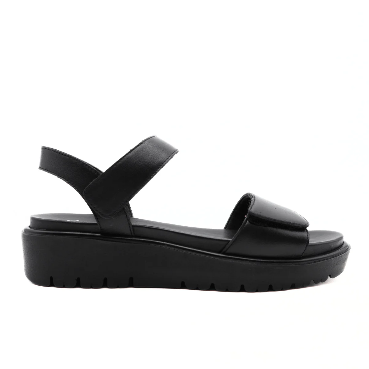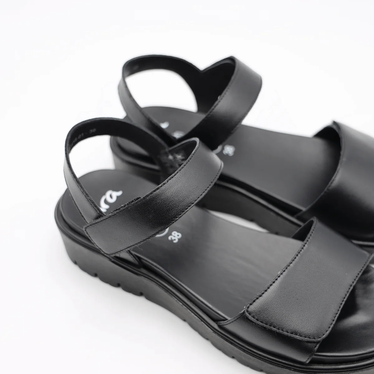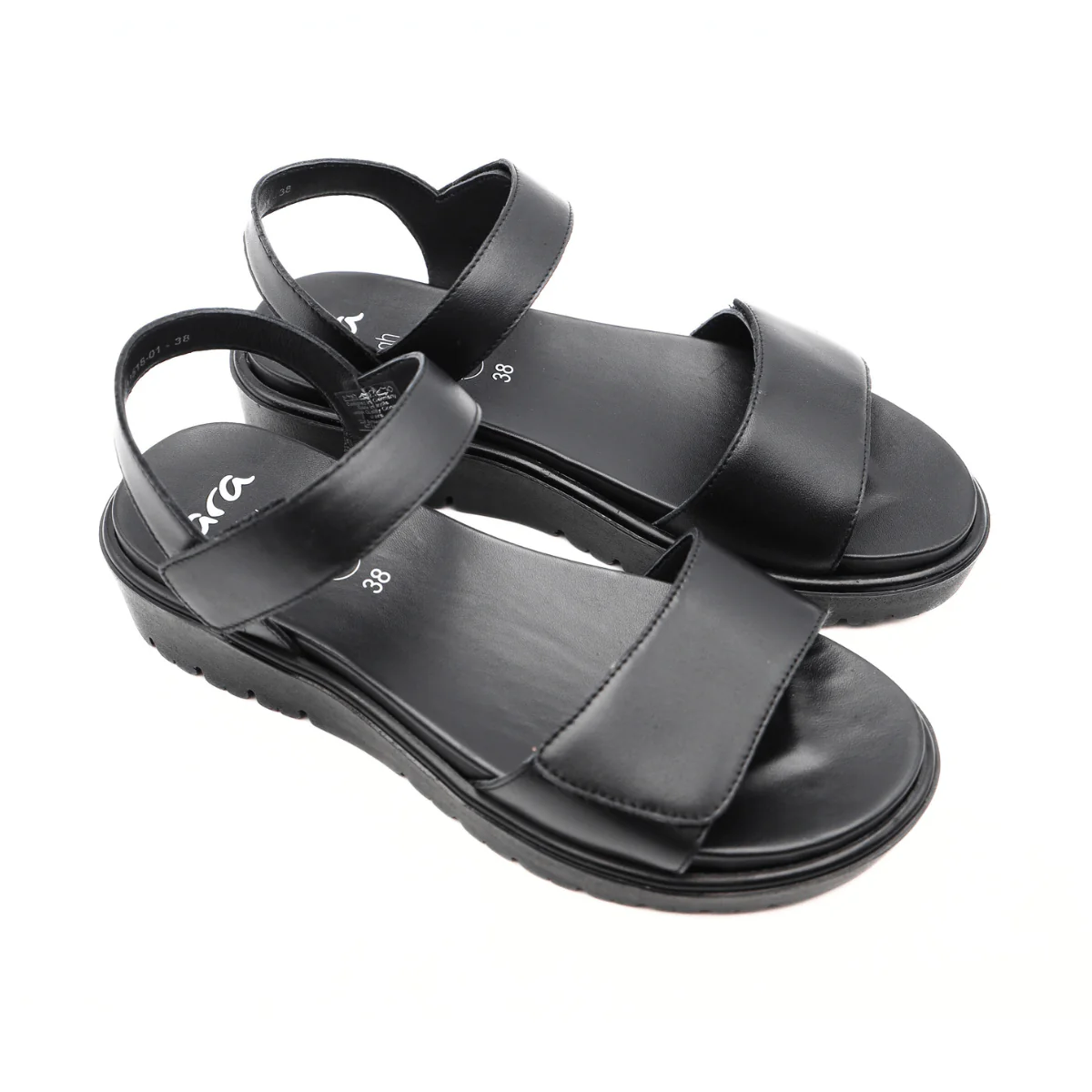 Sandalo da donna di ARA. Tomaia realizzata in pelle nera. Interno e sottopiede, removibile, foderati in pelle. Chiusura con strappi. Suola in gomma nera High Soft.