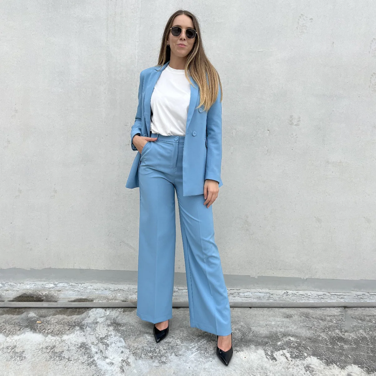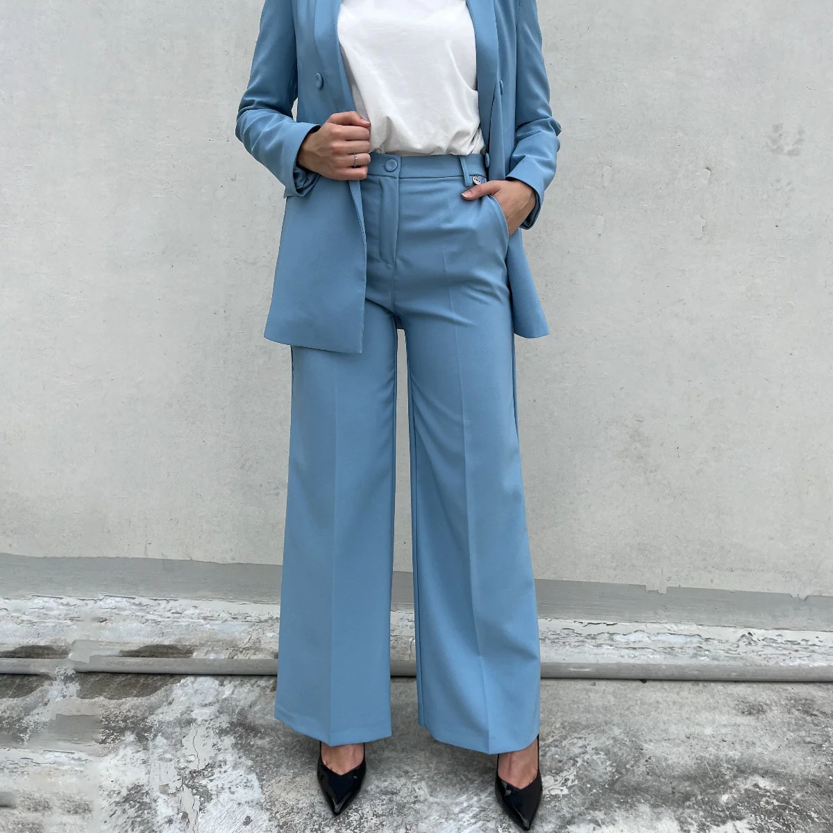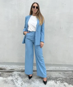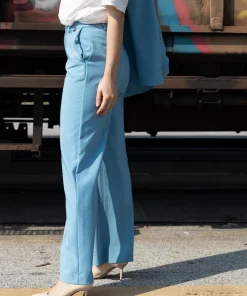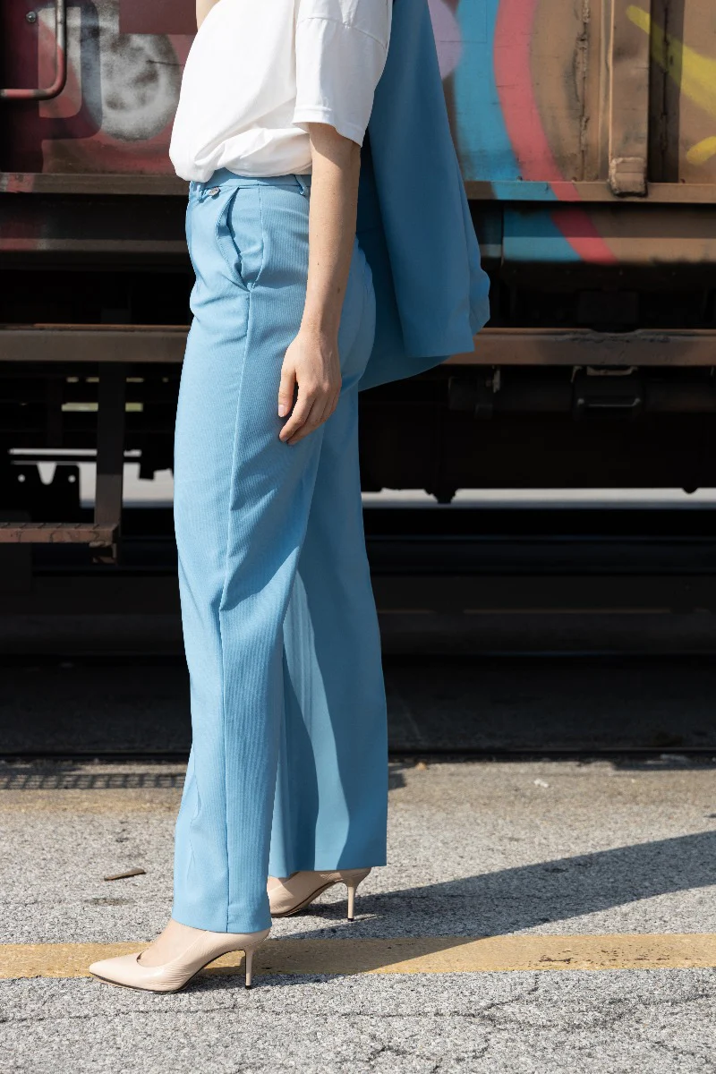 Pantalone a palazzo da donna di BERNA, color azzurro. Dotato di due tasche, chiusura a lapo con bottone in tessuto e passanti per la cintura.