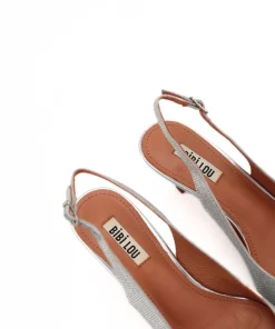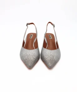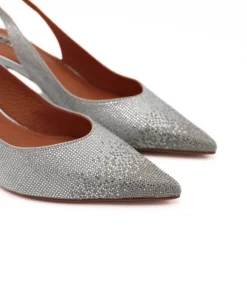 Slingback da donna di BIBI LOU, realizzata in raso argento con strass. Interno e sottopiede in pelle. Chiusura con cinturino regolabile. Suola in effetto cuoio con tacco sottile 5cm. Ideale per le tue cerimonie o per le tue serate.