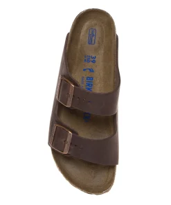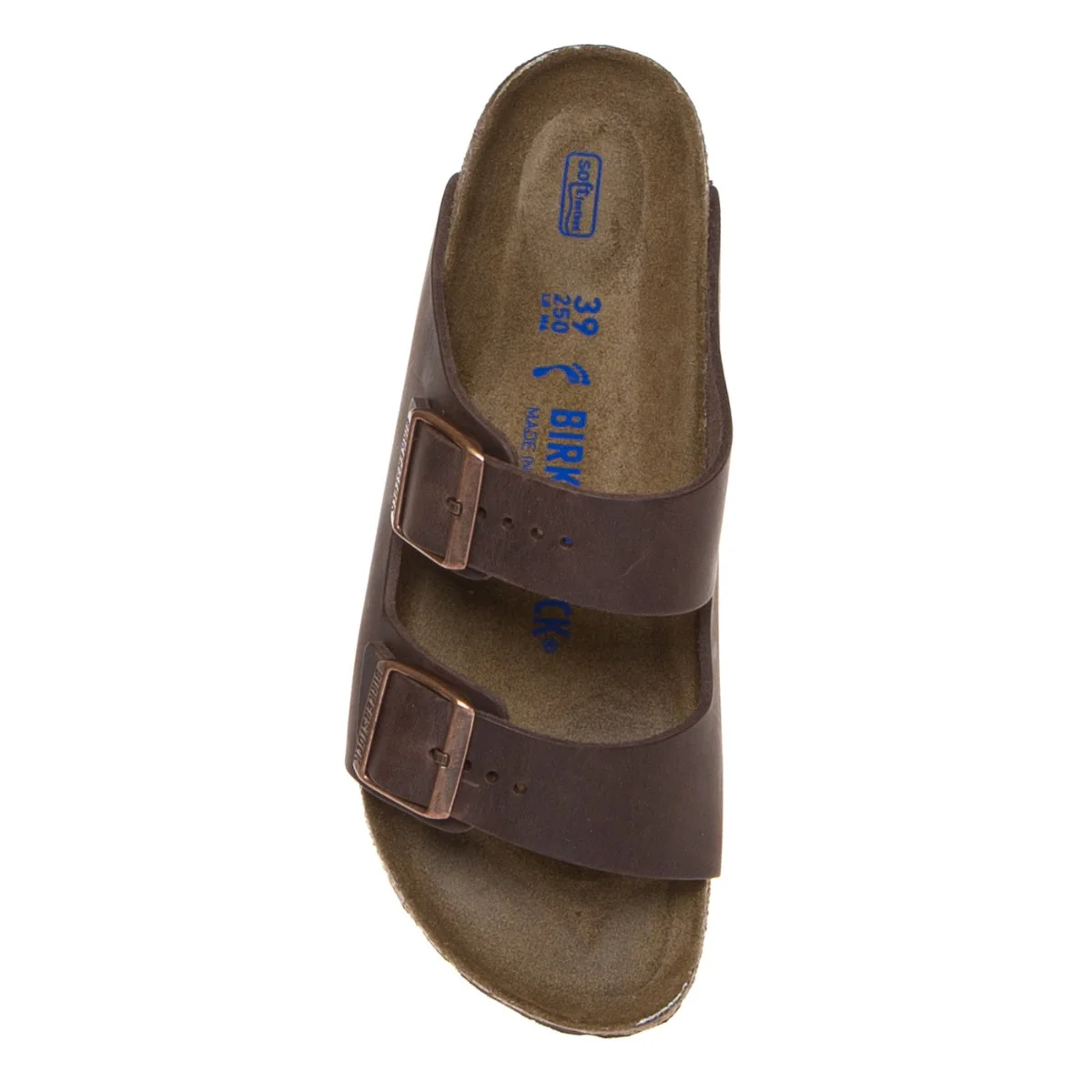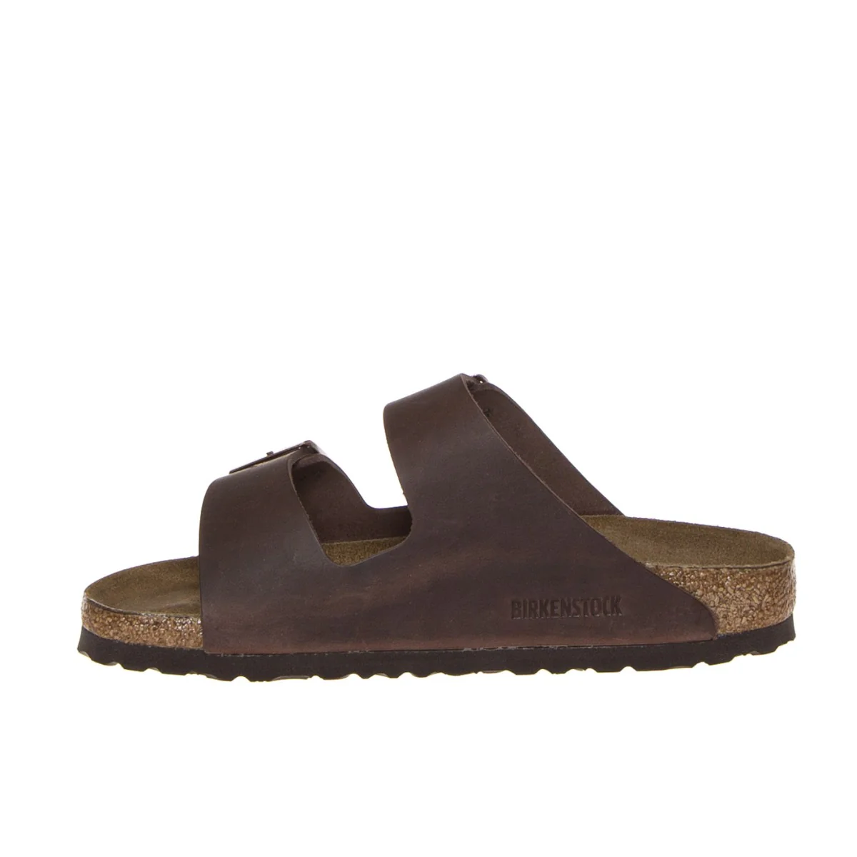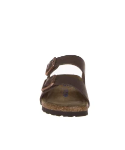 Ciabatta da donna di BIRKENSTOCK. Tomaia realizzata in pelle nabuk oliata-ingrassata color marrone, plantare Soft Footbed anatomico in sughero naturale e sottopiede in pelle scamosciata. Suola marrone in EVA. Fibbie metalliche color bronzo regolabili. Calzata: NARROW FIT.