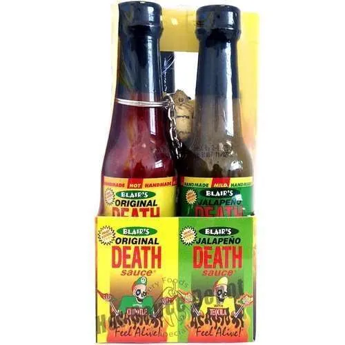 Mini bottiglie di salsa piccante di 4 sapori diversi della salsa Blair’s Death: Orginal Death Sauce, After Death Sauce, Jalapen Death Sauce e Sudden Death Sauce.