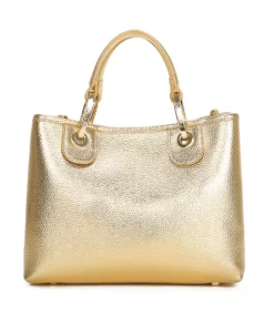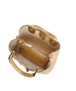 Borsa a mano di medie dimensioni di BRACCIALINI in similpelle di colore oro con doppi manici, chiusura con clip e tracolla in nastro logato rimovibile e regolabile che ne permette la doppia portabilità. All’interno una pochette totalmente estraibile e utilizzabile come seconda borsa a cui è possibile agganciare la tracolla a nastro. Il modello è arricchito da una catena removibile dorata con ciondoli raffinati, che aggiungono un tocco glamour al design.