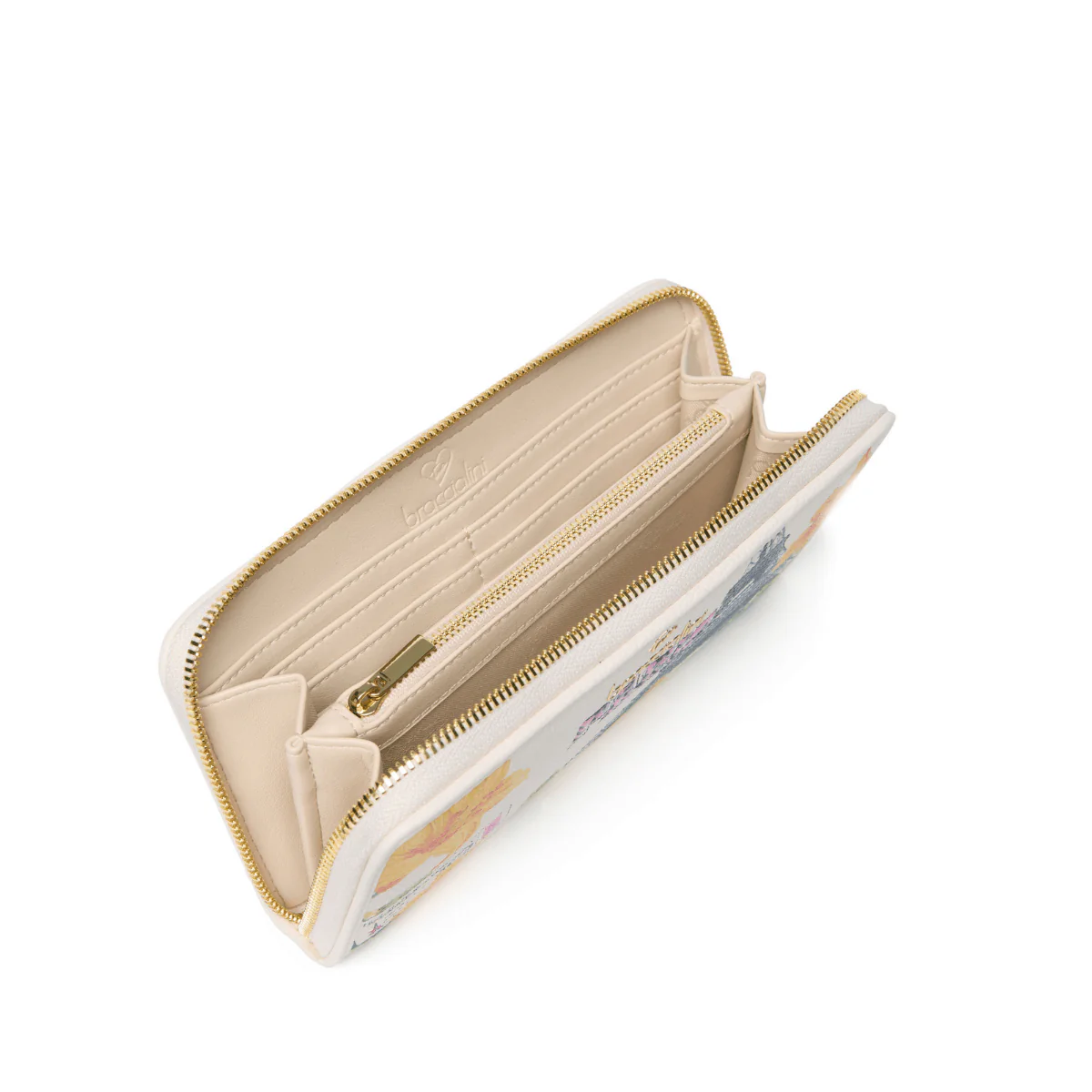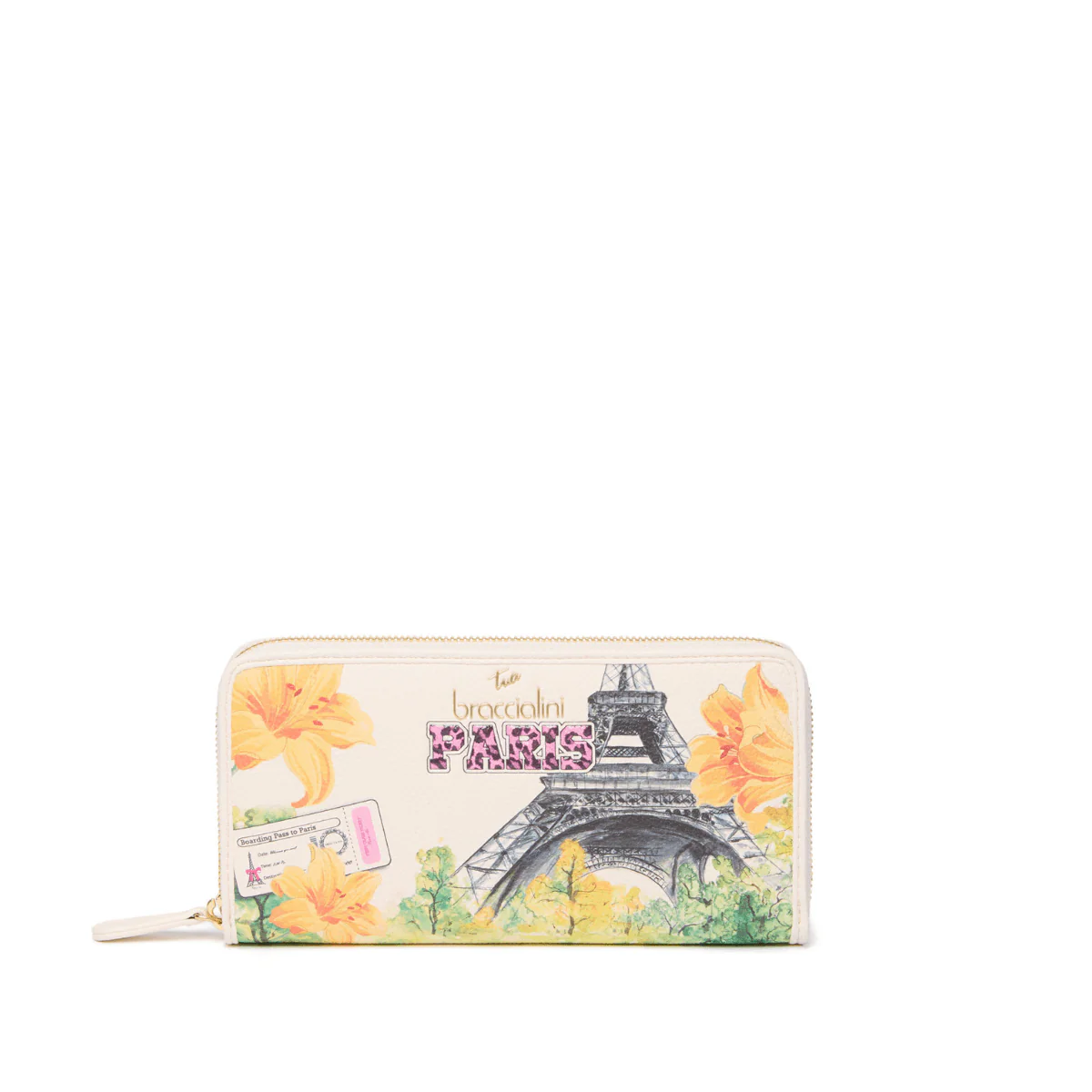 Portafoglio da donna di BRACCIALINI modello zip around con stampe e disegni che rappresentano Parigi. Interno con scomparti porta soldi, carte e monete. Chiusura con zip.