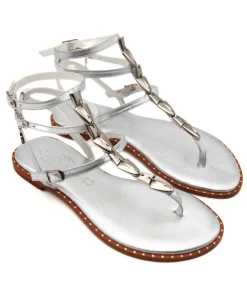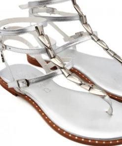Sandalo greco in pelle argento, decorato con accessori, di CARYATIS. Chiusura con cinturini regolabili. Morbido appoggio nel sottopiede foderato in pelle, suola in gomma antiscivolo, tacco 2 cm.