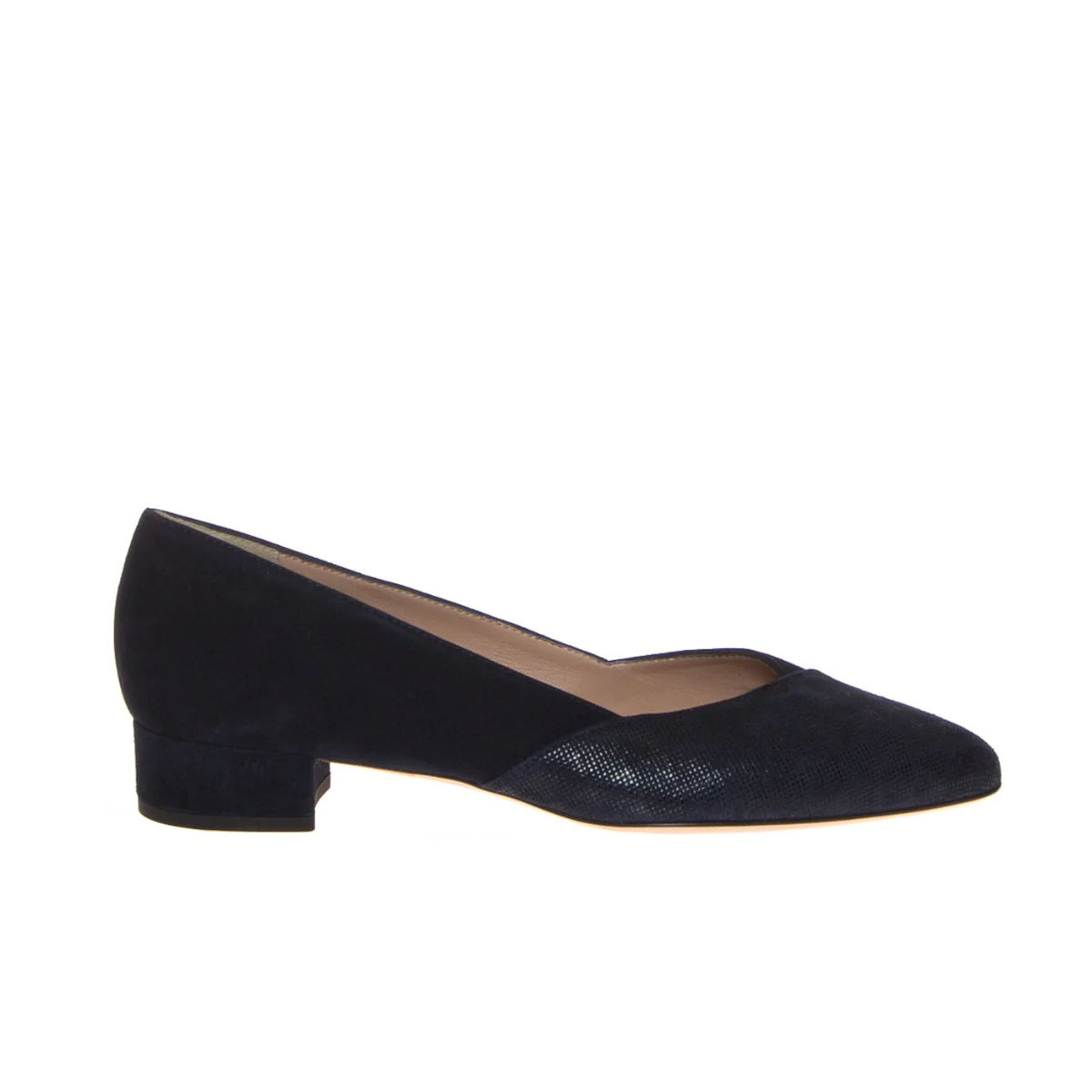 Décolleté donna di CINZIA VALLE. Tomaia realizzata in pelle nabuk stampata e camoscio color BLU. Interno foderato in pelle con sottopiede imbottito sul tallone. Suola in cuoio e tacco rivestito in camoscio. Made in Italy