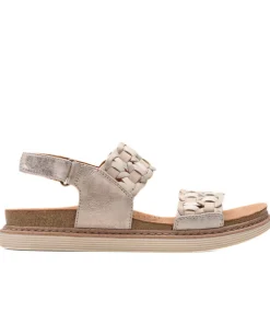 Sandalo da donna di CLARKS. Realizzato con una tomaia in nabuk intrecciato in metallo scintillante. Plantare Contour Cushion per supportare ogni tuo movimento, mentre una finitura leggera e aderente ti mantiene stabile sui piedi – dal giardinaggio alle fughe in spiaggia. La suola flessibile e stratificata in TPR (gomma termoplastica) garantisce una presa ottimale sotto i piedi. Altezza del tacco: 35mm
