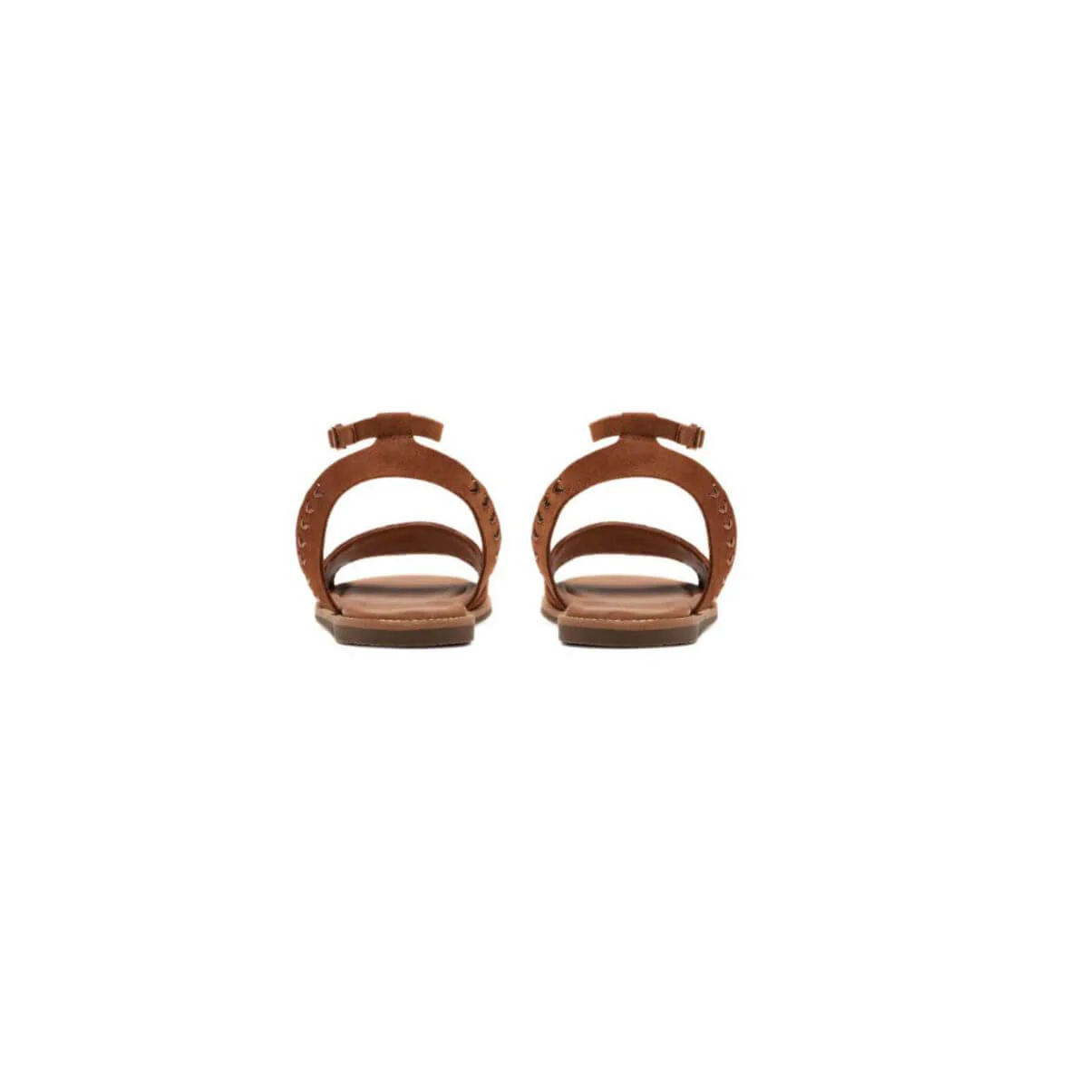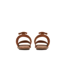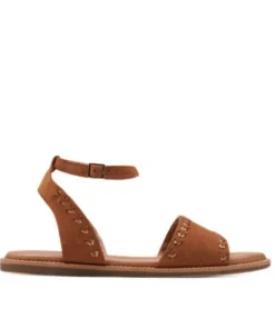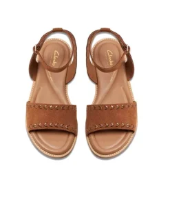 Sandalo da donna di CLARKS. Realizzato in pelle scamosciata cuoio con fascia con cuciture. Chiusura con cinturino regolabile in caviglia. Interno e sottopiede, anatomico, foderati in pelle morbida Suola in gomma.