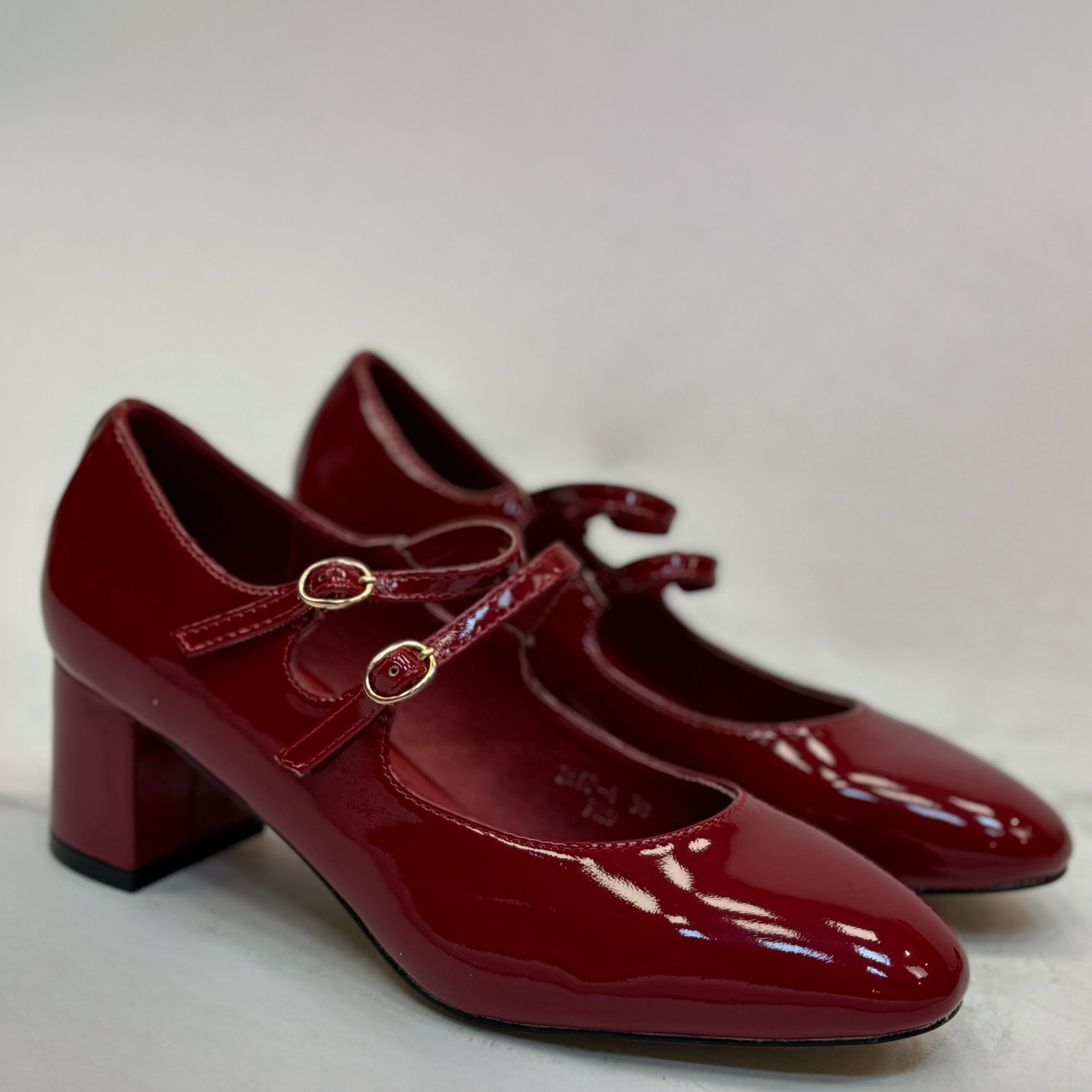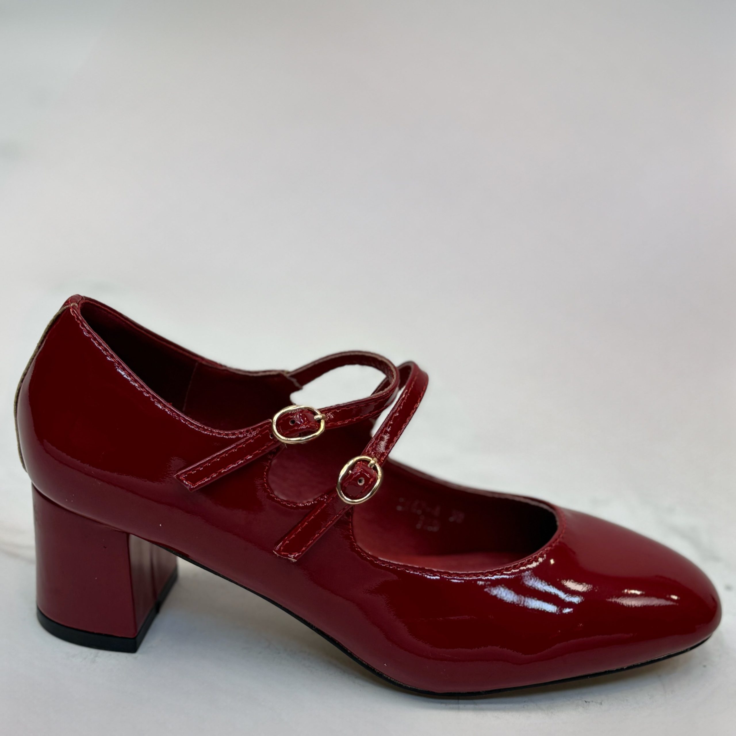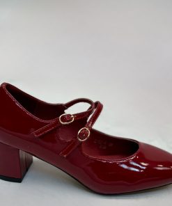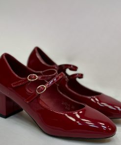 Decollete a punta con tacco largo e fibbie in tessuto lucido.