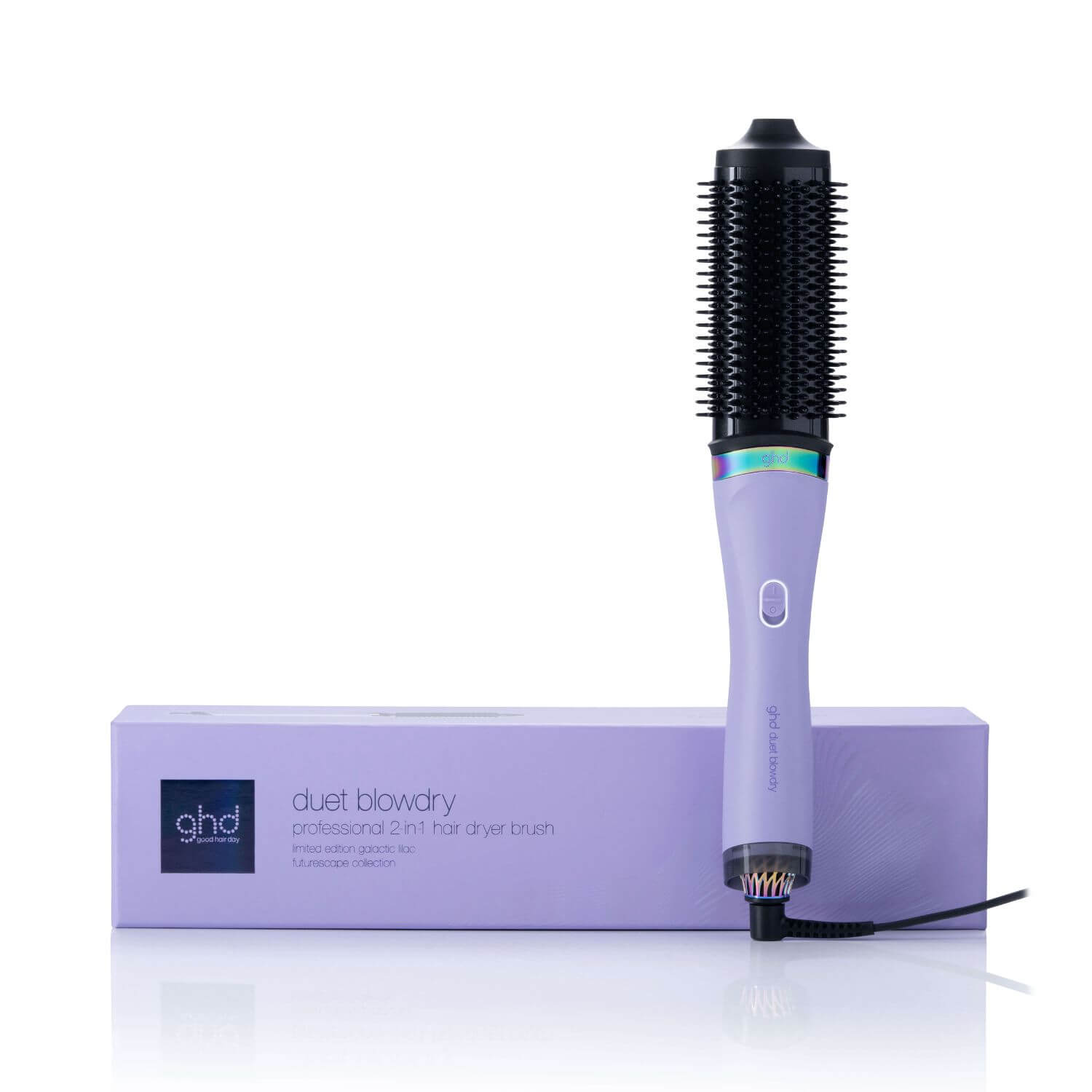 Ghd Duet Blowdry™ in edizione limitata viola galattico, parte della collezione Futurescape. Questa spazzola asciugacapelli 2-in-1 asciuga e modella contemporaneamente, offrendo una piega voluminosa e senza danni da calore estremo.