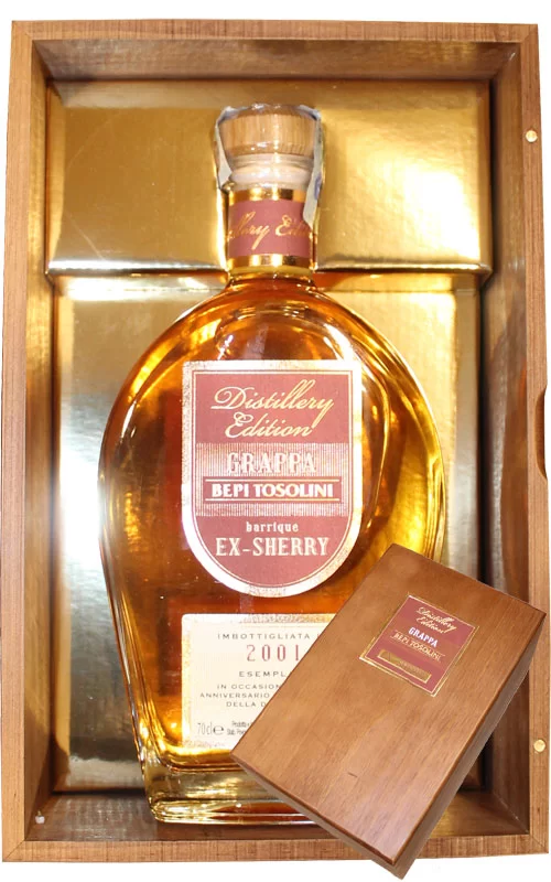 Grappa di uve nobili 40° stagionata in barrique Ex-Sherry. In decanter in vetro massiccio, con elegante cofanetto in legno.