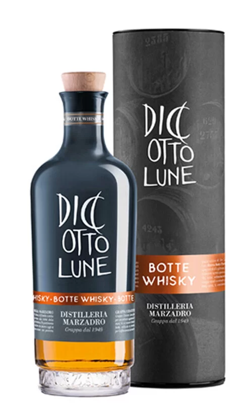 Grappa Marzadro le Diciotto Lune nasce da un blend di vitigni sia di vinacce rosse che di vinacce bianche, per poi essere affinata 18 mesi in piccole botti di ciliegio, frassino, rovere e robinia. Riserva Botte Whisky è un’edizione speciale caratterizzata da un invecchiamento aggiuntivo in un numero limitato di botti scozzesi accuratamente selezionate, utilizzate in precedenza per l’affinamento di Whisky torbati e non. L’ulteriore affinamento evidenzia un contrasto grappa-legno più netto ed un sentore torbato.