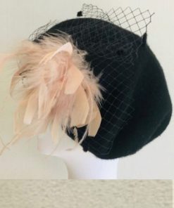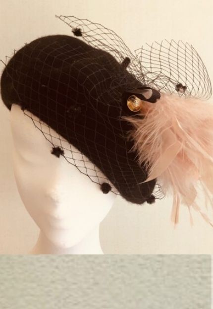 Coccarda con piuma color cipria e veletta nera con mosche. Piccolo fiocco in canapè, fermato da bottone dorato.
