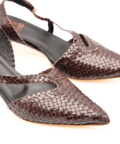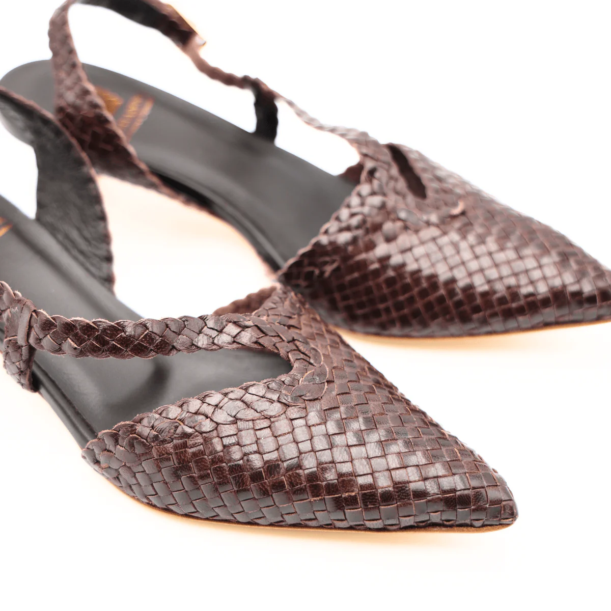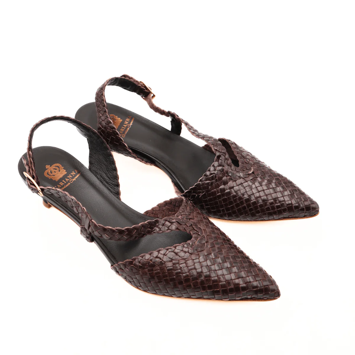 Comodissimo slingback di L’ARIANNA, Realizzata in pelle intrecciata marrone con cinturino regolabile alla caviglia. Interno e sottopiede, morbido, in pelle. Suola in cuoio.