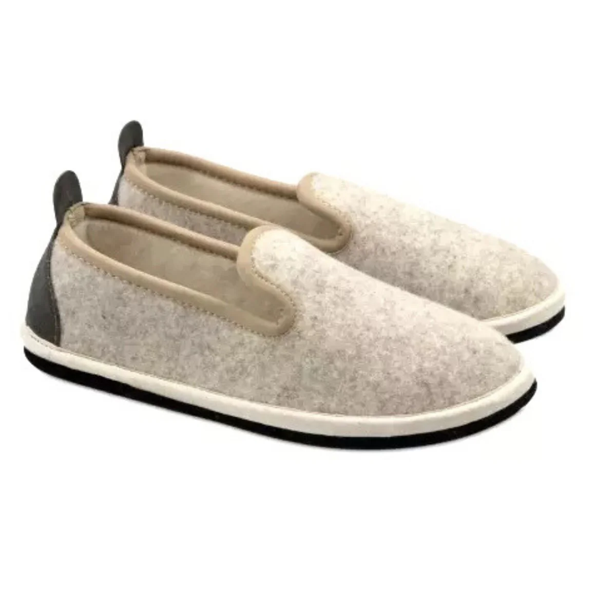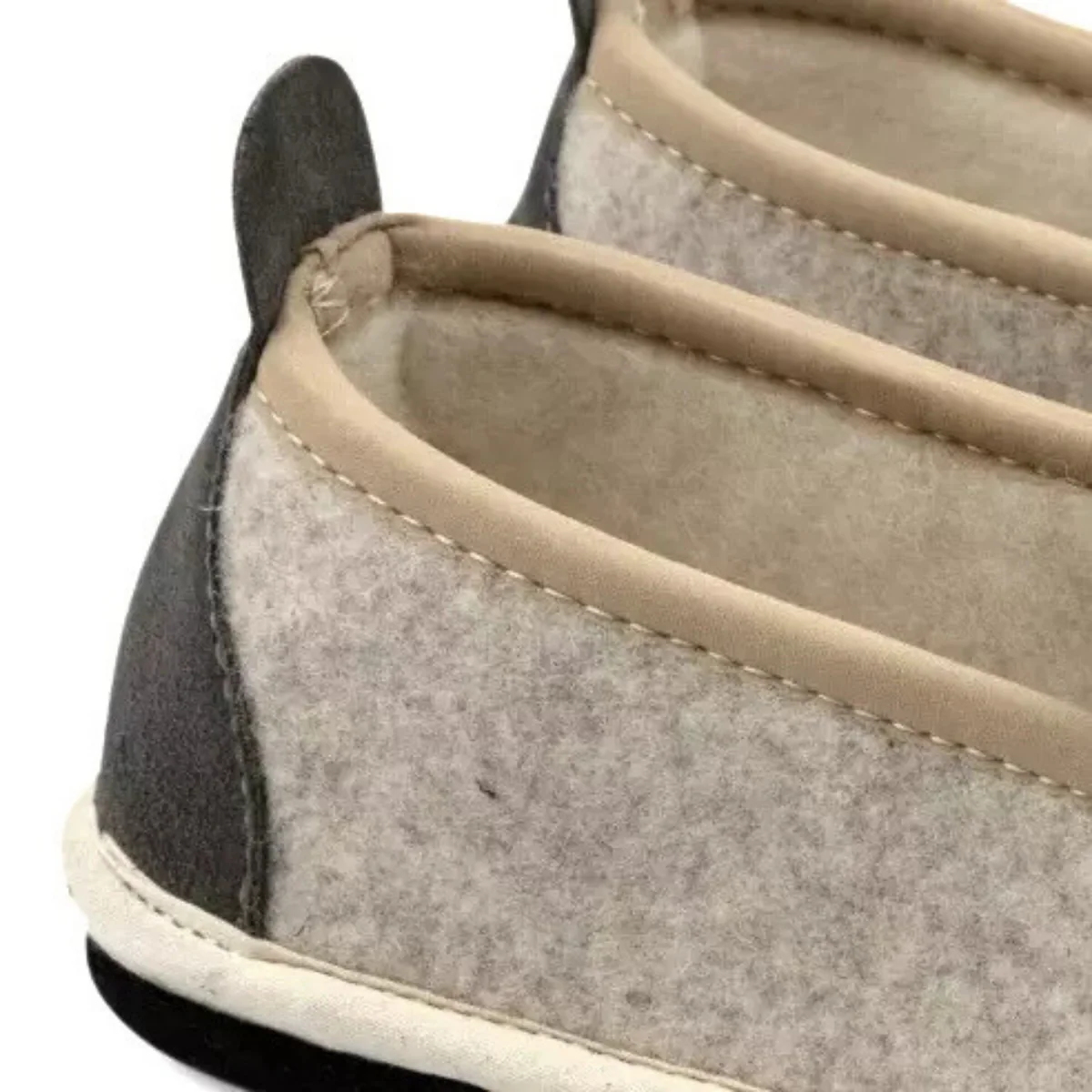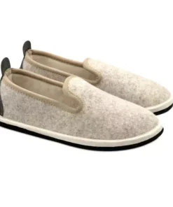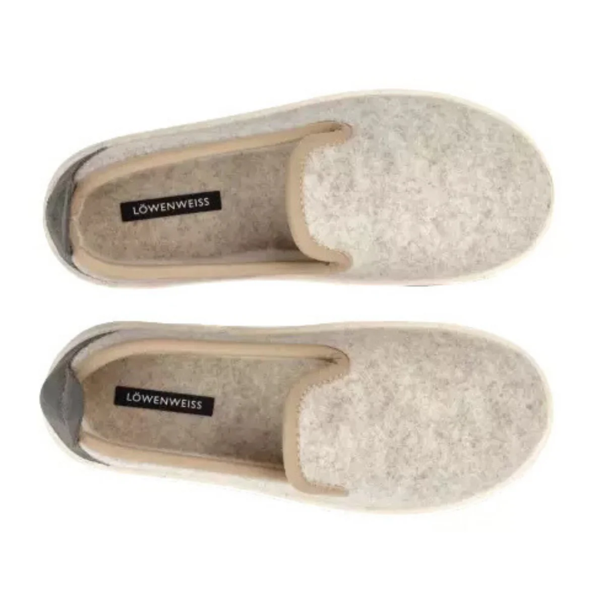 Pantofola donna di LÖWENWEISS modello Pal. Tomaia realizzata in feltro di lana colore beige. Plantare interno rivestito in morbido feltro. Suola lavorata a mano in feltro e lattice naturale.