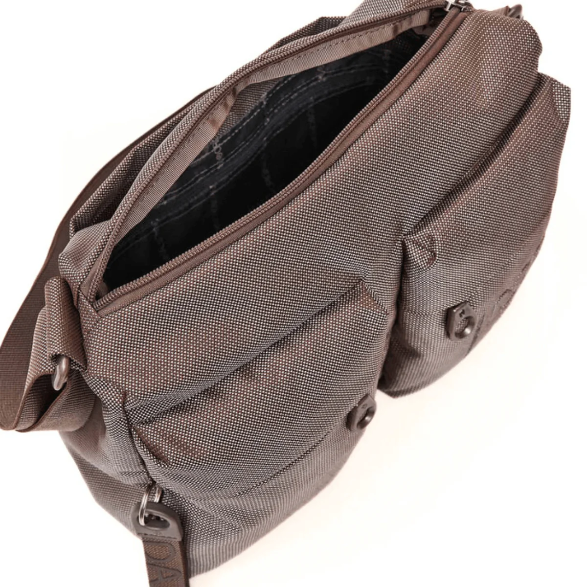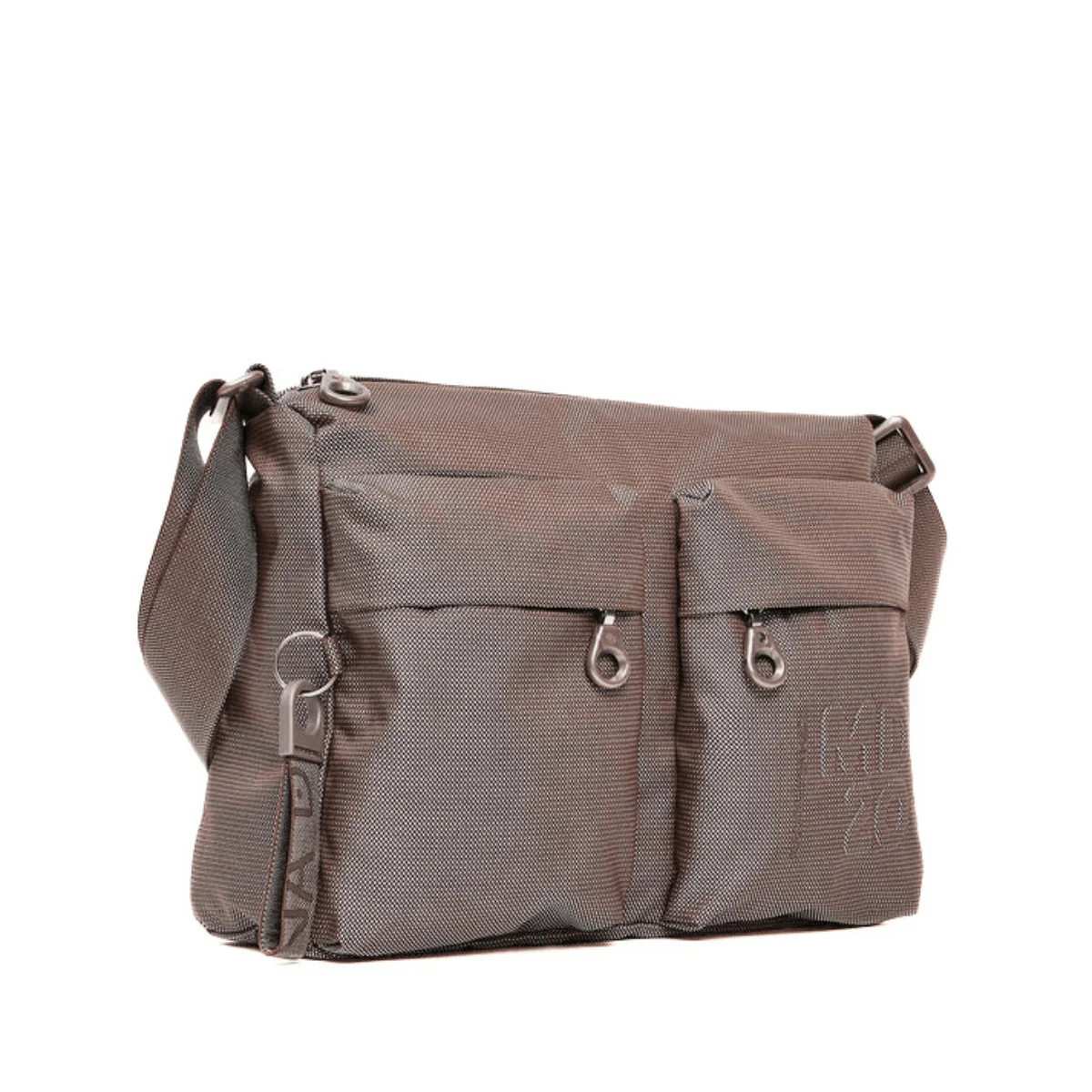 Borsa a tracolla media di MANDARINA DUCK con doppie tasche frontali in tessuto. Doppia portabilità, tasche smart frontali e interne, dettagli personalizzati e tracolla regolabile in jacquard.