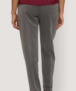 Pantalone elegante da donna di MARKUP realizzato in tessuto gessato grigio. Pantalone con gamba stretta, chiusura con bottone e zip. Dettagli brillantinato nel passante. La modella indossa una 38.