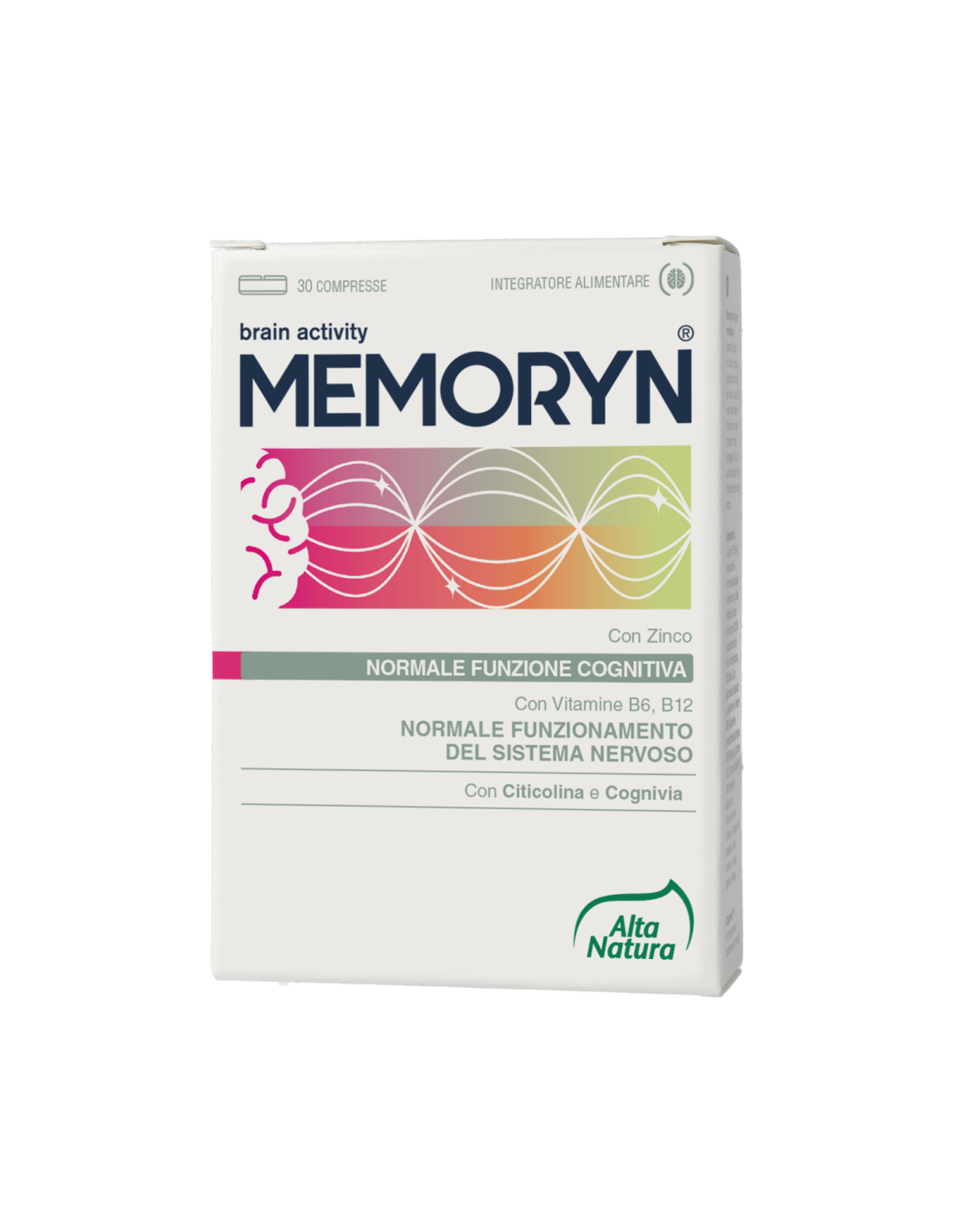 Memoryn è un integratore alimentare a base di estratti vegetali e citicolina. La Vitamina B6 e la Vitamina B12 contribuiscono al normale funzionamento del sistema nervoso, lo Zinco contribuisce alla normale funzione cognitiva, la Vitamina B9 contribuisce alla riduzione della stanchezza e dell’affaticamento.