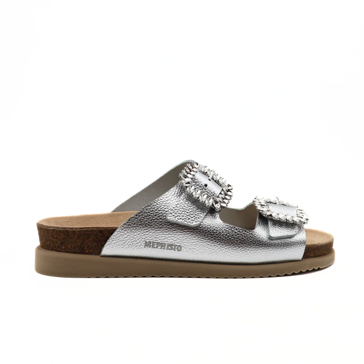 Ciabatta argento di MEPHISTO, modello HAZINA. Caratterizzato cinghie regolabili e fibbie con strass. Questo sandalo è realizzato in pelle liscia e granulata a effetto metallico. Il tacco piatto misura 1.2 cm.