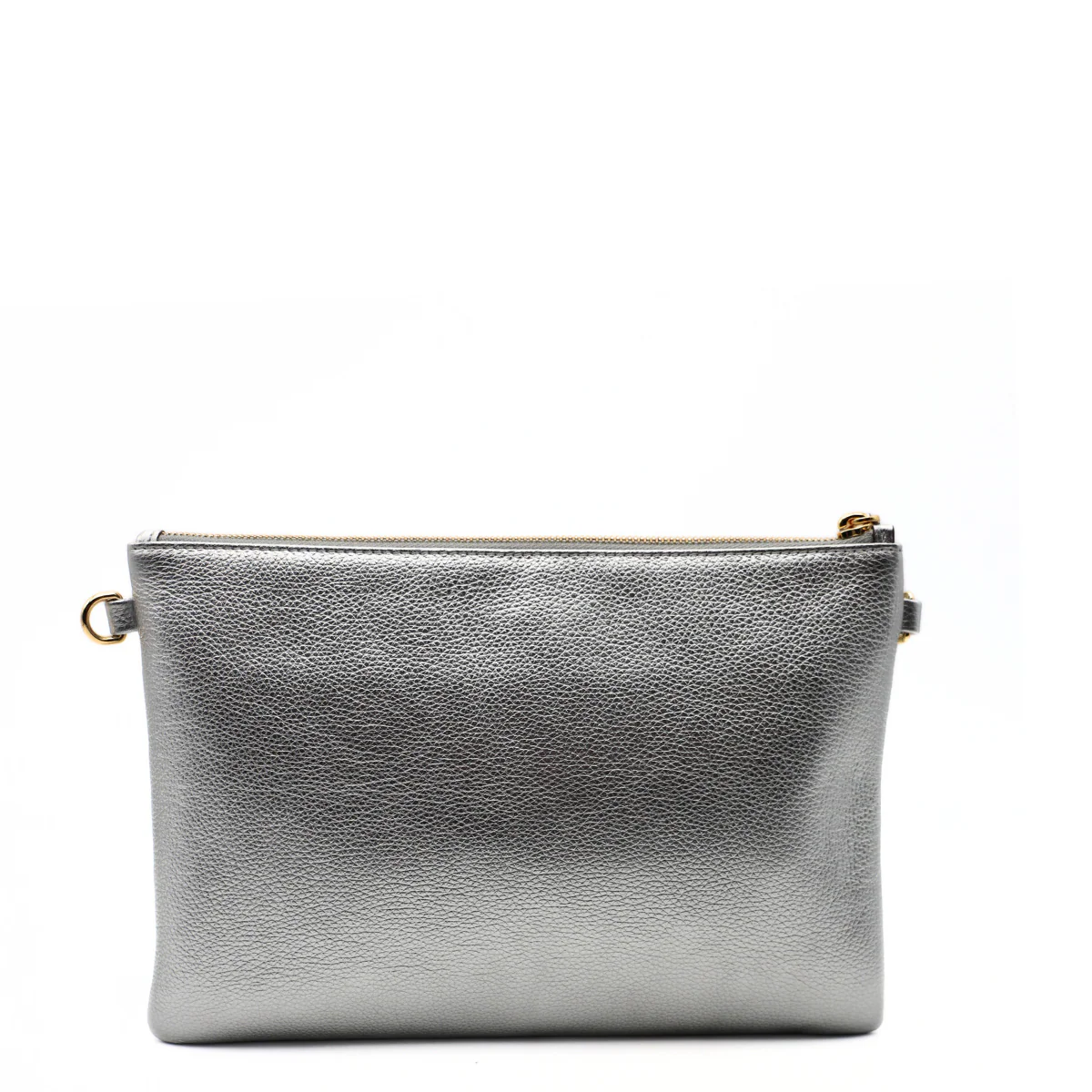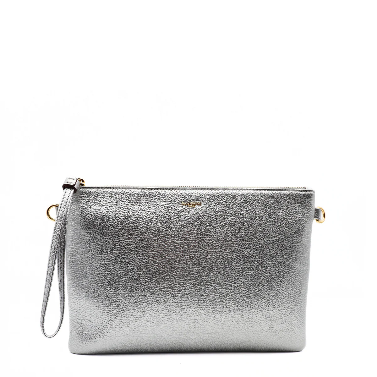 Bustina portatutto di NANNINI realizzata in pelle bottalata laminata argento con logo oro. Unico comparto interno con tasche accessorie. Chiusura con zip. Tracolla removibile in dotazione.