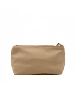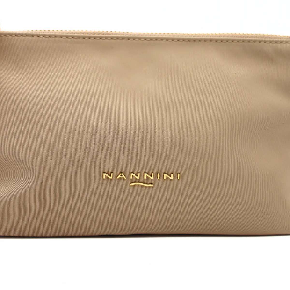 Pochette di NANNINI realizzata in nylon di colore beige. Logo metallico oro applicato e scomparto principale con chiusura zip. Laccio in pelle per portabilità al polso.