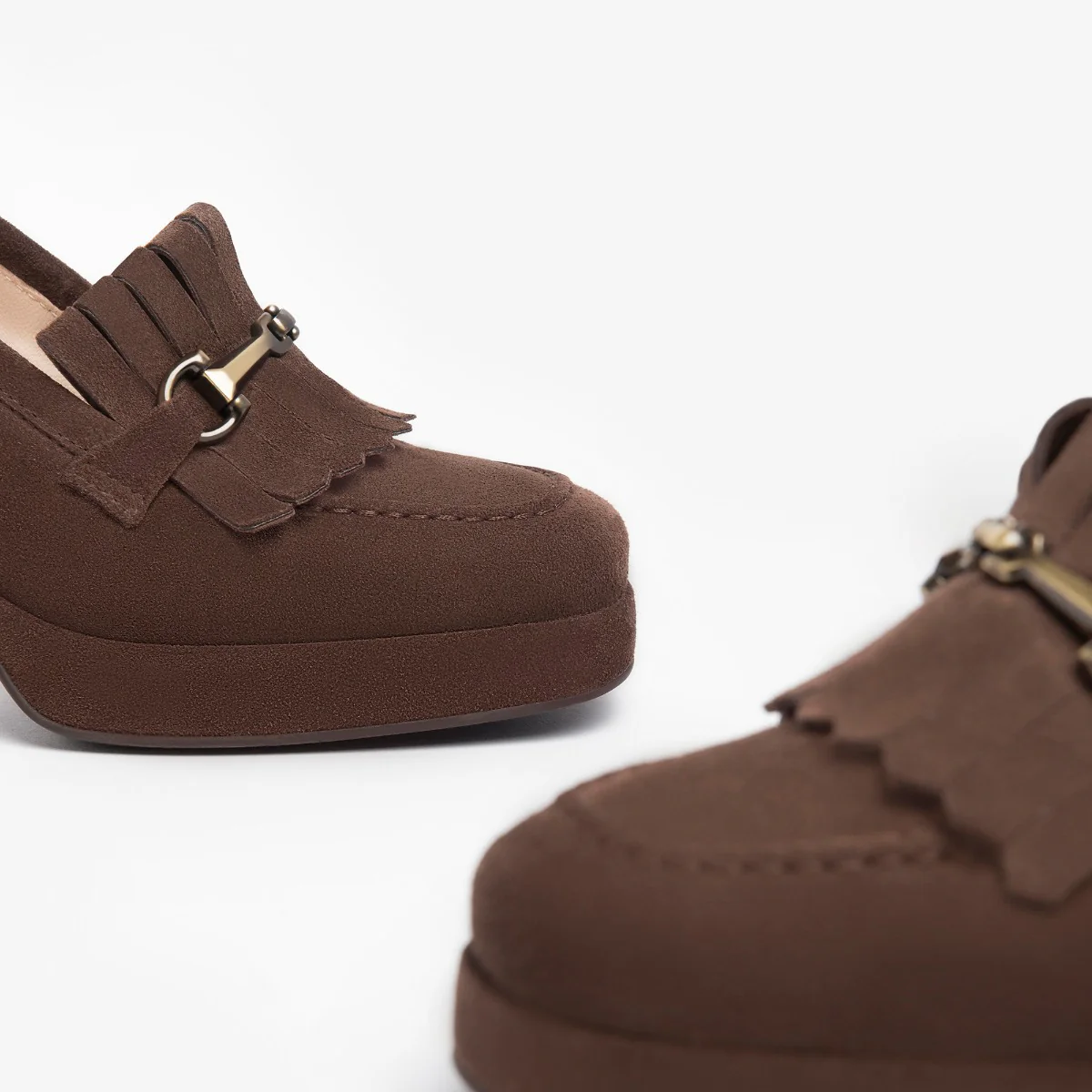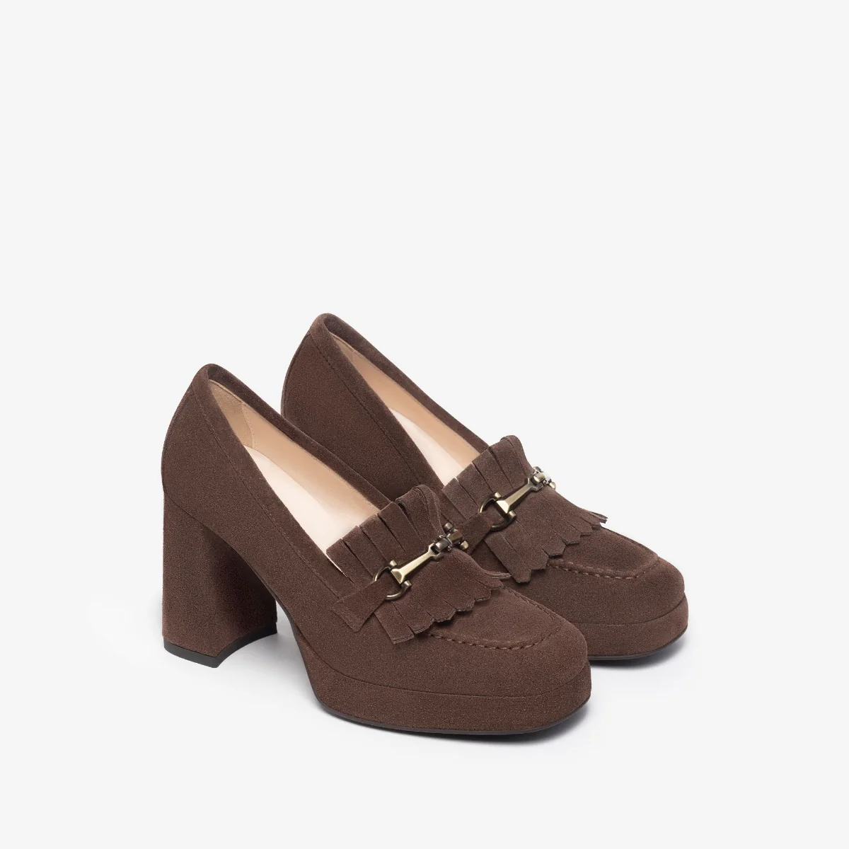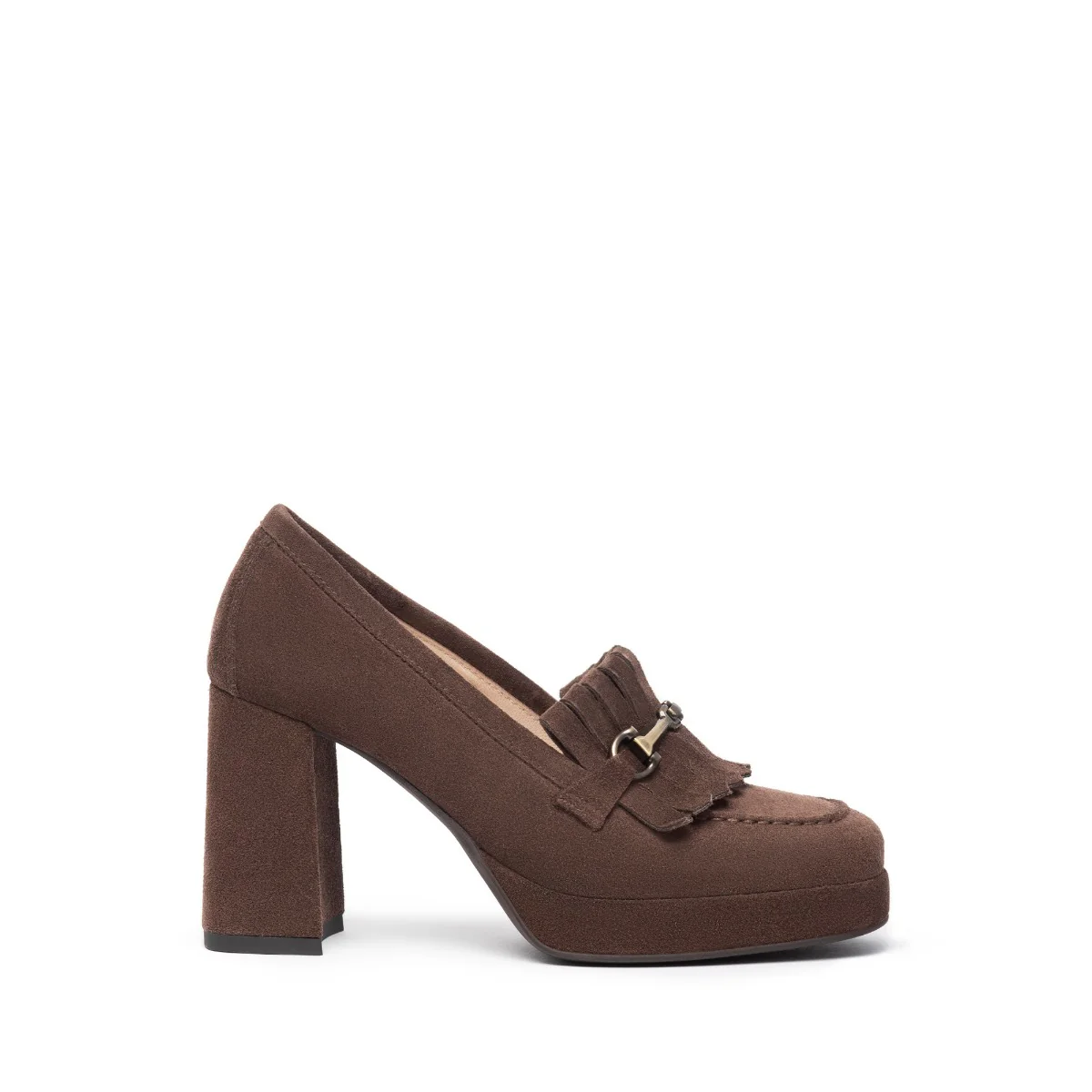 Mocassino donna di Nero Giardini. Tomaia realizzata in pelle scamosciata color testa di moro con morsetto oro e frange. Interno foderato in pelle, sottopiede non estraibile. Suola in gomma.