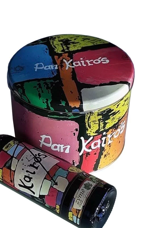 Panettone con crema e canditi al mosto di vino Kairos di Zymè, in una simpatica latta di metallo colorata.