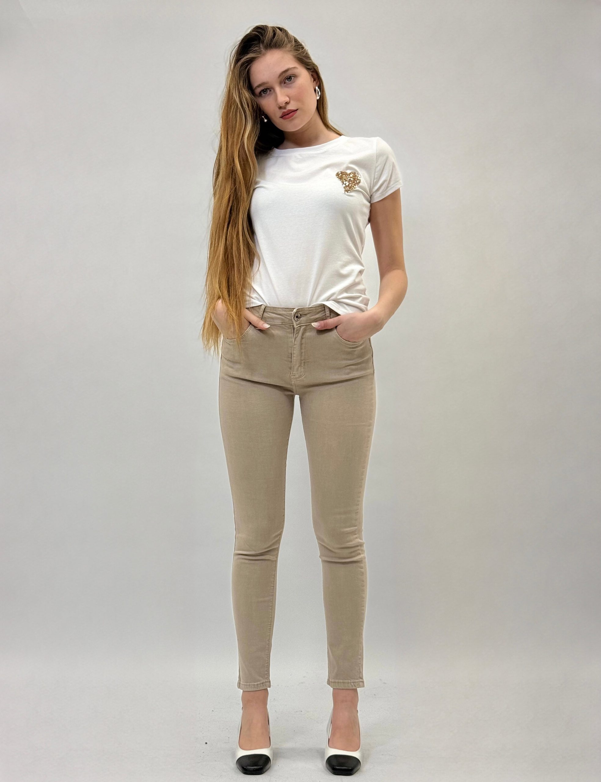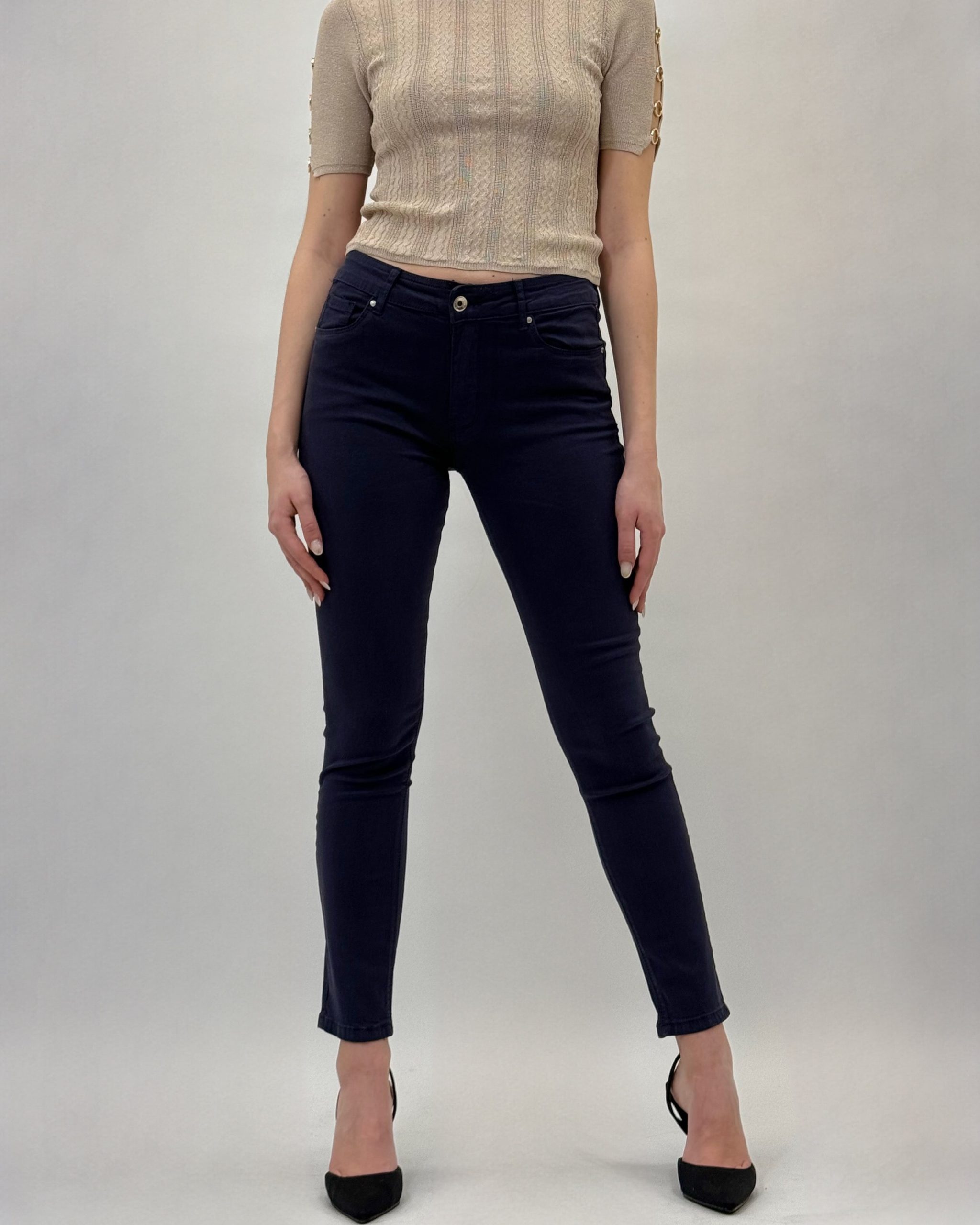 Pantaloni jeans adoro. Comodi. Chiusura zip e bottone. Dettagli tasche.