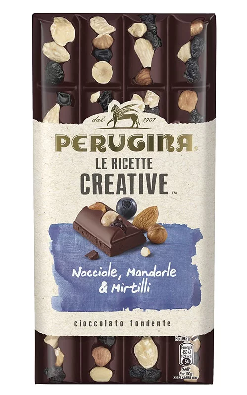 Tavoletta di cioccolato fondente extra con mirtilli, nocciole e mandorle.