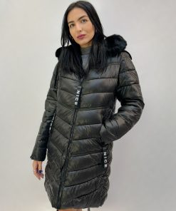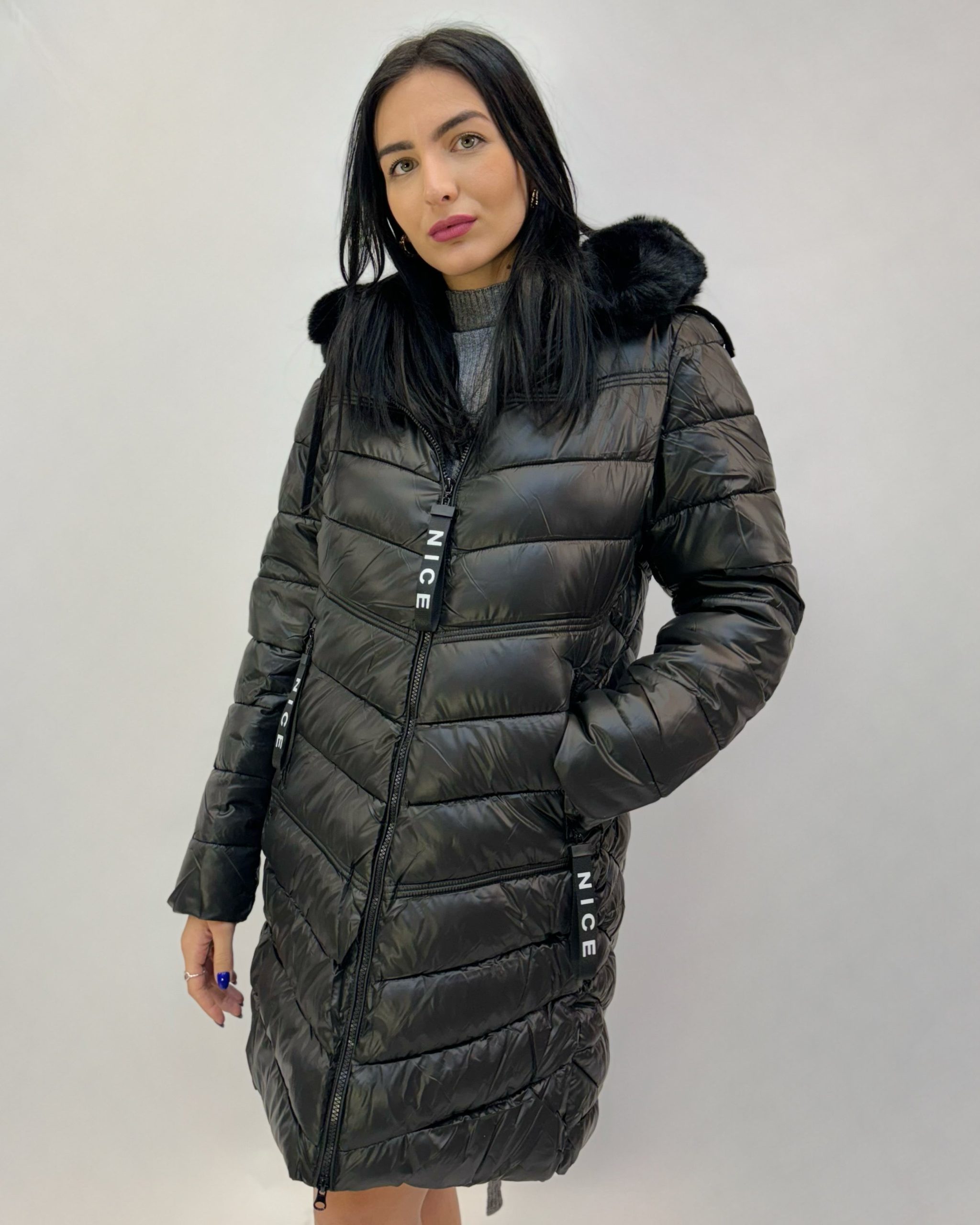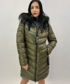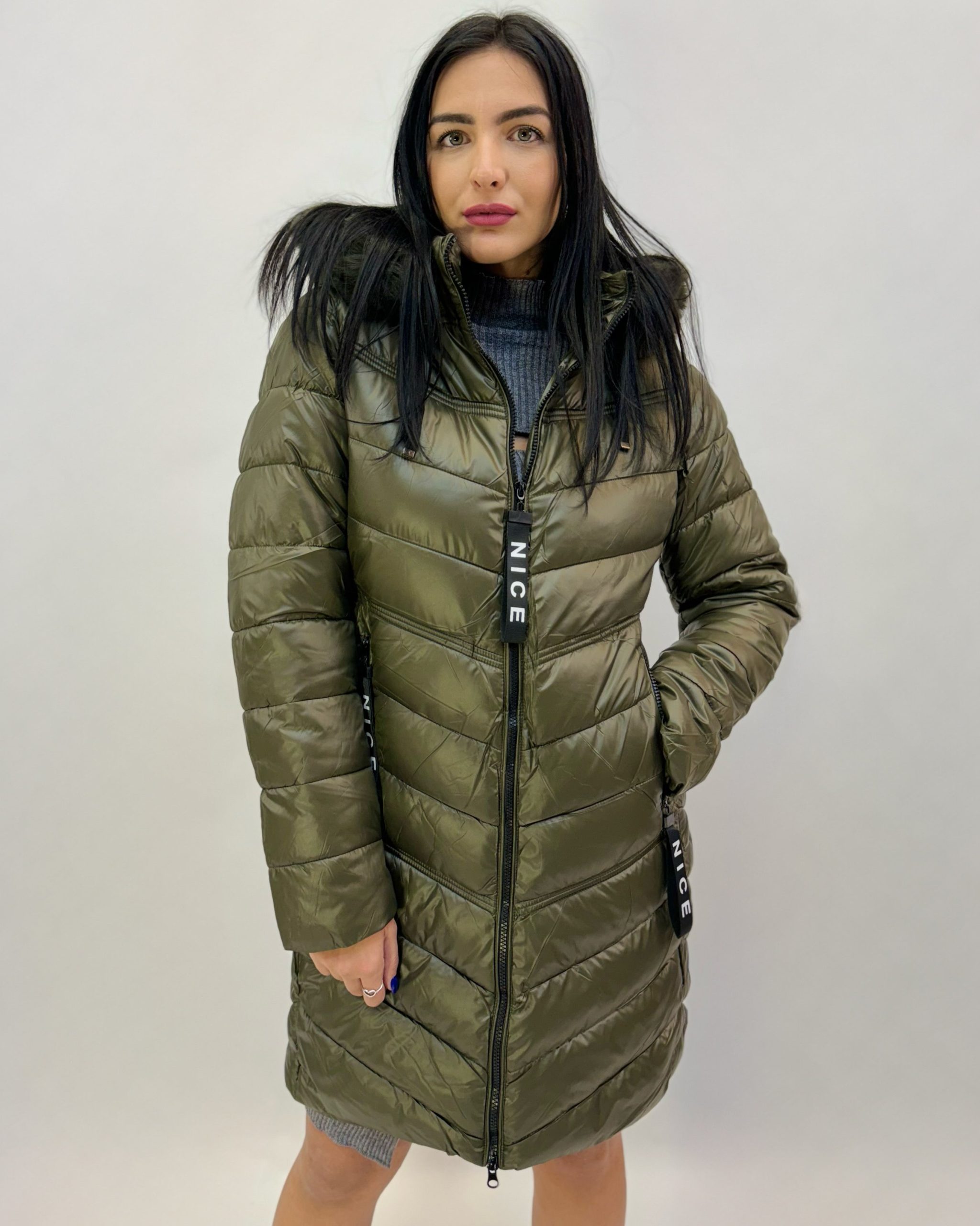 Piumino pesante caldo con cappuccio sintetico. Tasche. Zip.