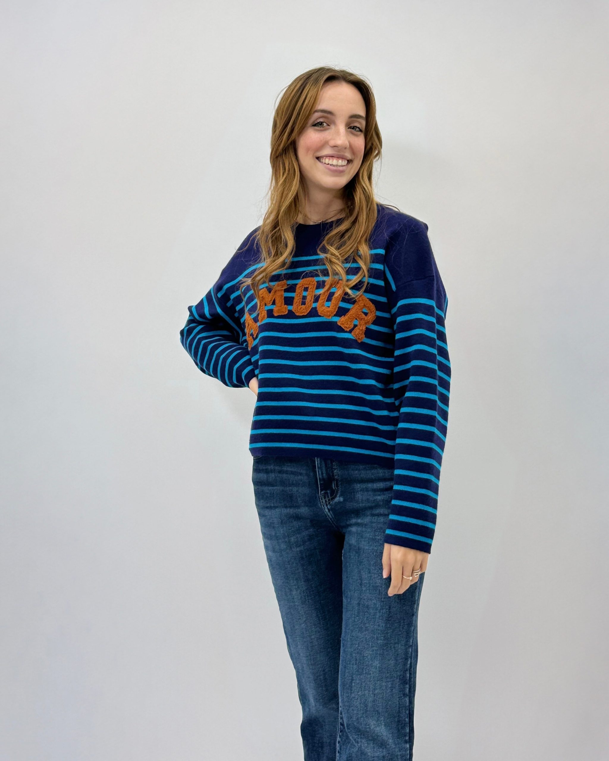 Pullover morbido con scritta amour. Veste comodo.