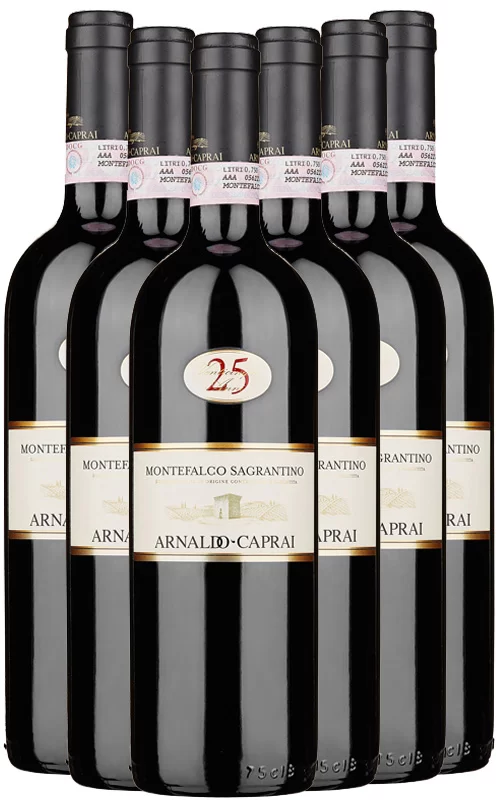 6 bottiglie 2016 della Riserva DOCG 25 anni di Caprai, che affina per 24 mesi in barrique di rovere francese (su un minimo di 12 mesi in legno richiesto dal disciplinare). Al naso è davvero complesso, con sentori di confettura di mora, rosa, noce moscata, pepe, resina di pino, menta, chiodi di garofano e cacao. Al palato è morbido, suadente, sembra non finire mai.