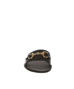 Ciabatta in pelle nera, con accessorio dorato nella fascia, di S. PIERO. Sottopiede in pelle-cuoio, suola in gomma antiscivolo, tacco 1 cm. Calzatura artigianale made in Greece.