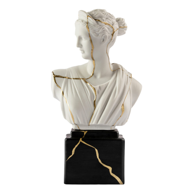 Porta a casa la bellezza senza tempo dell’antica Grecia con il busto di Diana. Prodotto in pura porcellana bianca su base nera, il busto della dea della caccia è stato realizzato con la tecnica kintsugi: un particolare intreccio di linee dorate che emerge dall’idea che dall’imperfezione e da una ferita possa nascere una forma ancora maggiore di bellezza estetica e interiore.