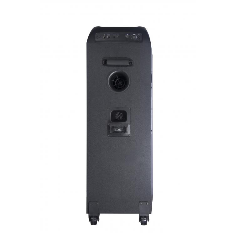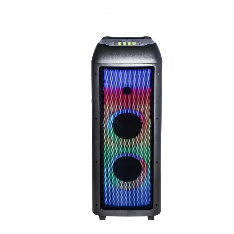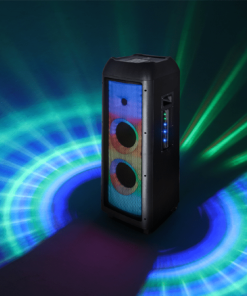 nPARTY SPEAKER A TROLLEYnnGIOCHI DI LUCE E AUDIO A 360°nnDJ PAD CON 64 EFFETTI SONORInn6 ALTOPARLANTI PER UN SUONO COINVOLGENTEnn nnSistema Multimediale wireless audio a trolleynnDisplay a LEDnn2 woofer da 8” + 1 tweeter da 1” e 3 altoparlanti da 2” per l’effetto audio a 360°nnPotenza D’uscita massima 10.000W (P.M.P.O)nnPotenza in RMS 150WnnQuattro effetti luci LED selezionabilinnFunzione TWS (True Wireless Stereo)nnIngresso USB per la riproduzione di file MP3nnIngresso AUX-IN da 3,5mmnnIngressi MIC e Chitarra da 6,35mmnnFunzione X.BASSnnEqualizzazione toni alti/bassinnEffetto Eco regolabile per MIC e ChitarrannTelecomando in dotazionennAlimentazione con cavo AC 100/240V – 50/60 Hz (cavo AC incluso)nnImpugnatura e ruote per il trasporto facilitatonnDimensioni prodotto: 37,5 (L) x 34,2 (P) x 94,5 (H) cm